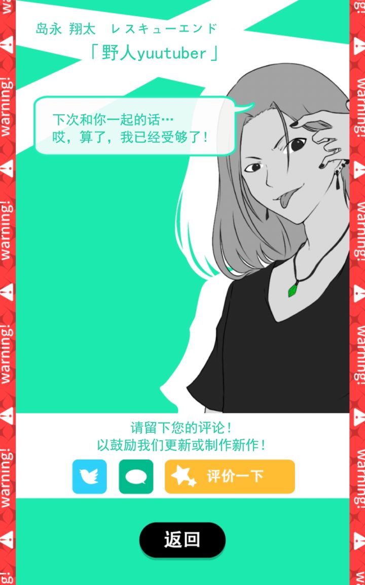 第一位就是游戏一开始就准备好的人物[ 岛永 翔太 Shimanaga Shouta ]是一位刚从大学毕业但学生气未脱的(主人公)学长,打算靠做Yuutuber来养活自己,并且现在打算做一个无人岛生存的影片来赚取知名度/点击率。最佳选项为 3131322333323112331121接下来,翔太的死亡点是,第一,选择食物的时候,有紫苏叶,青虫和紫色蘑菇。选择1"紫苏叶" 开启第一个Bad