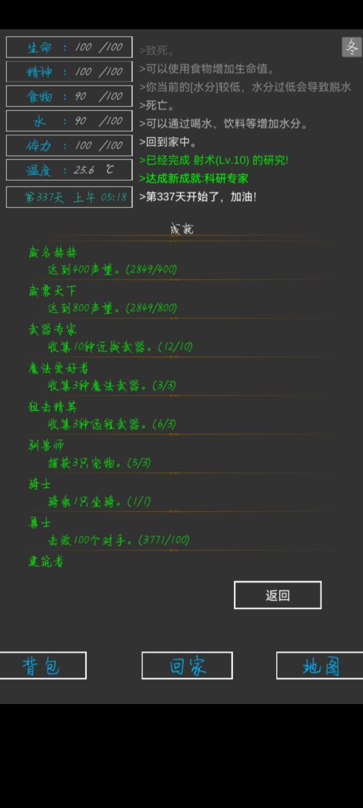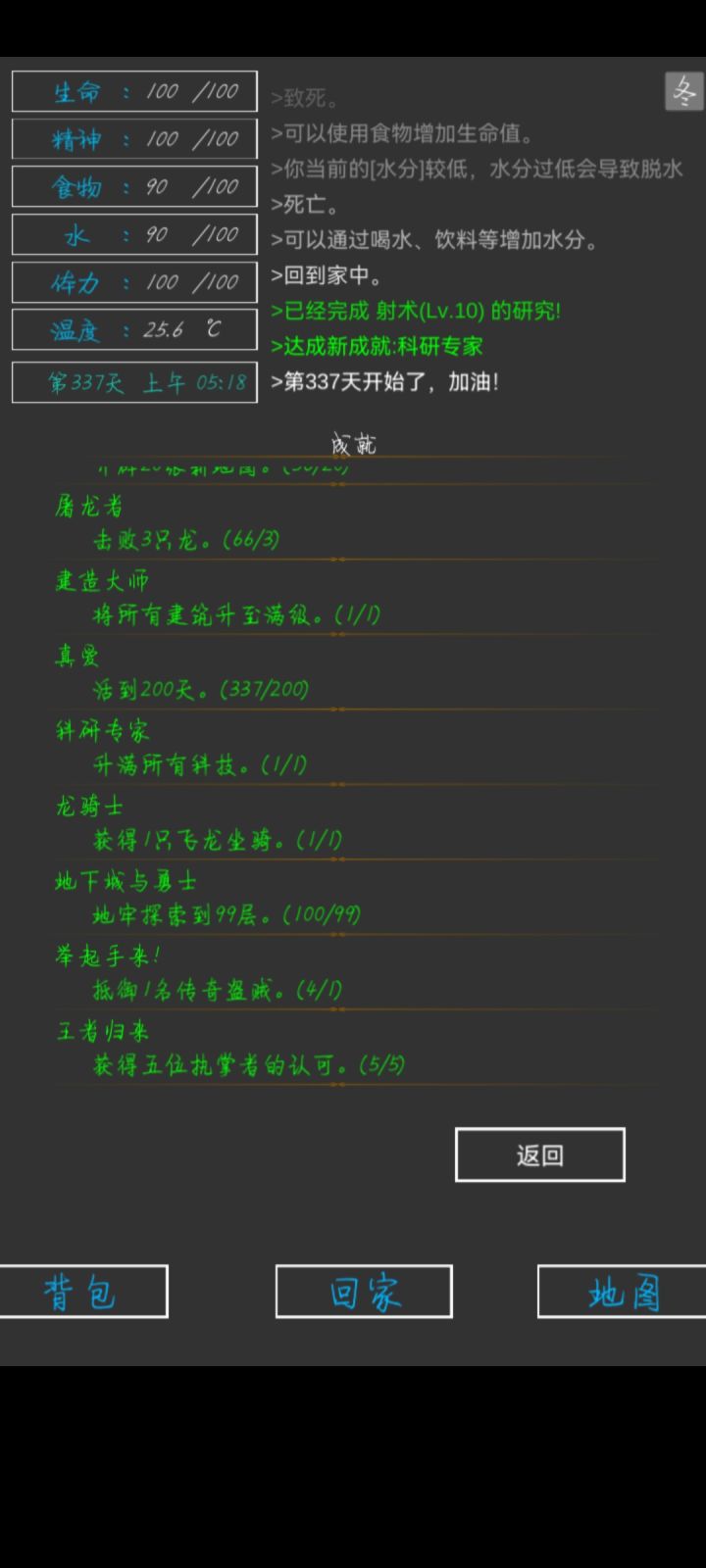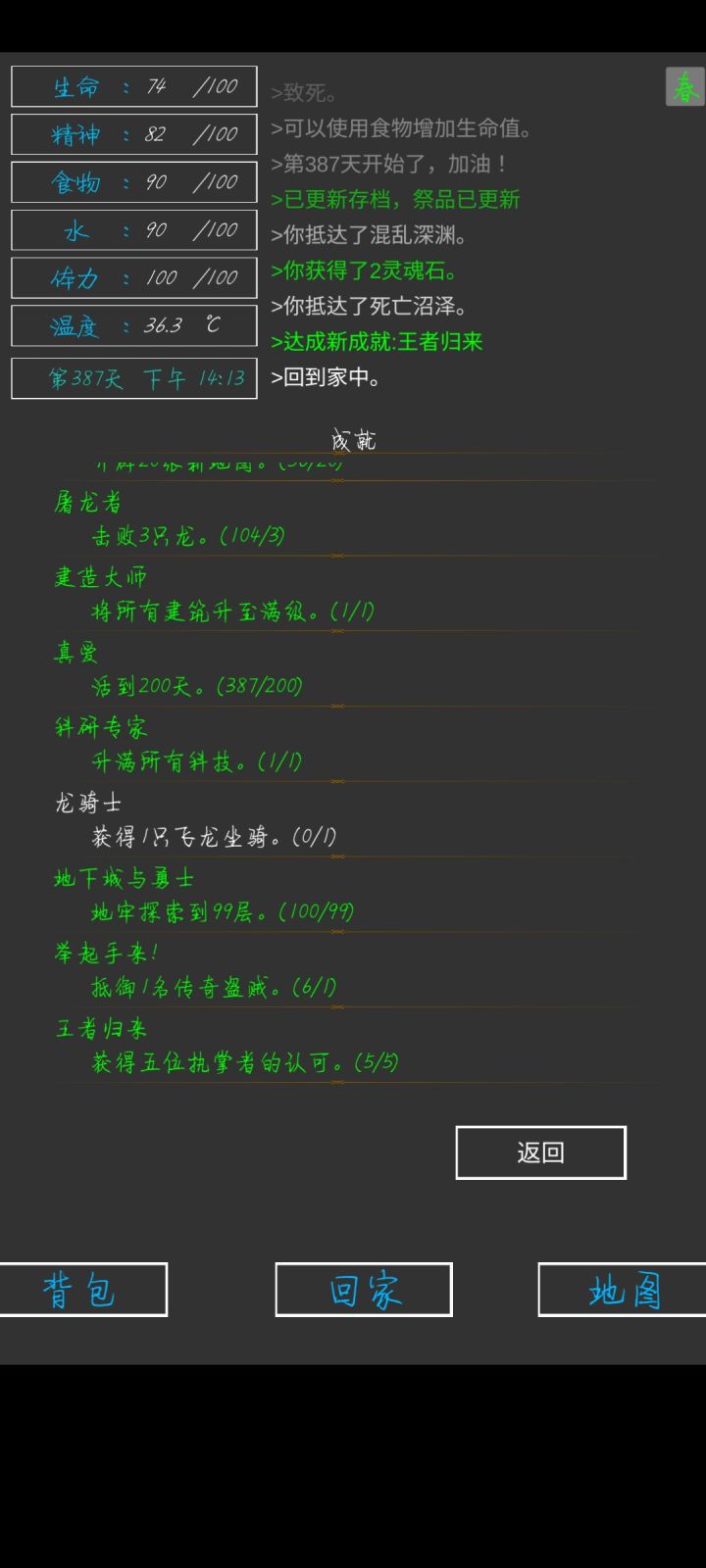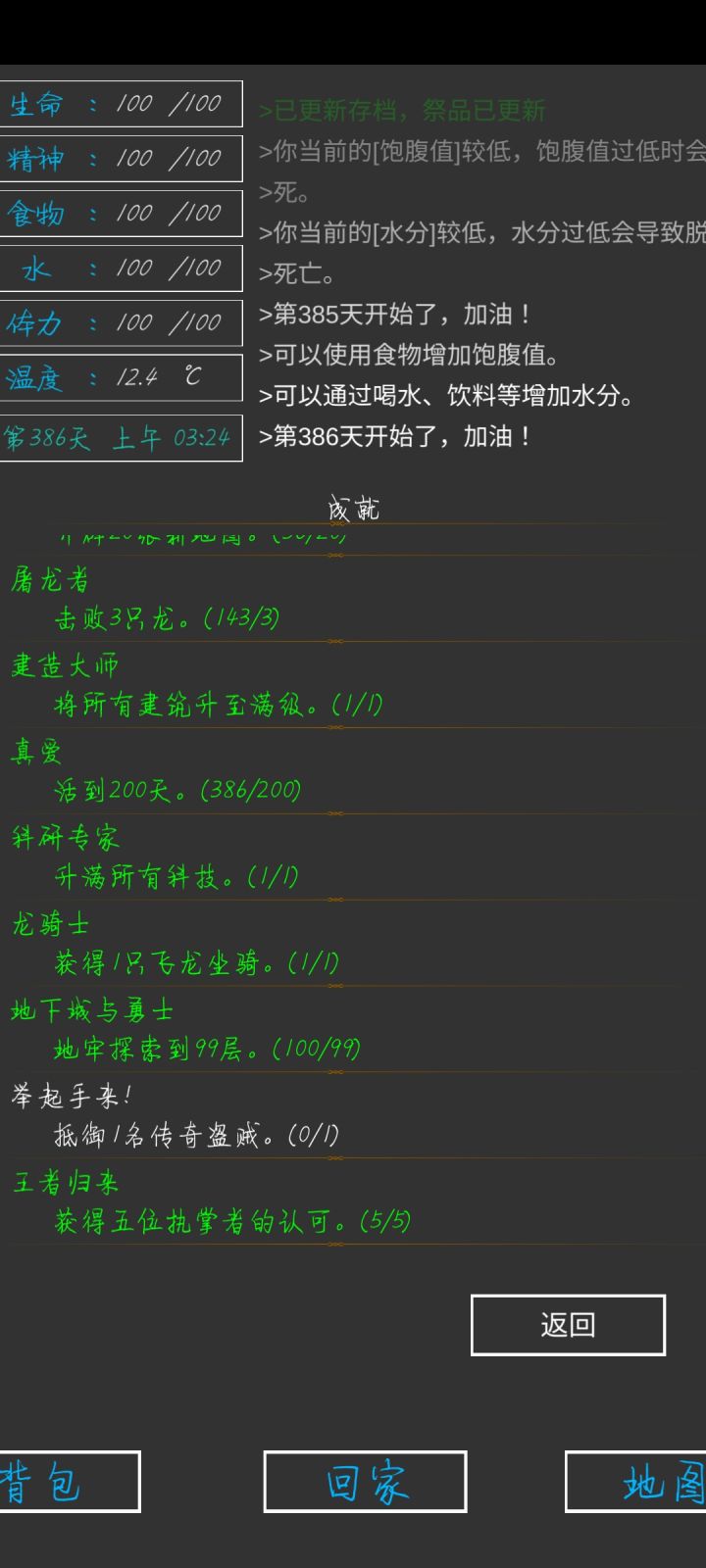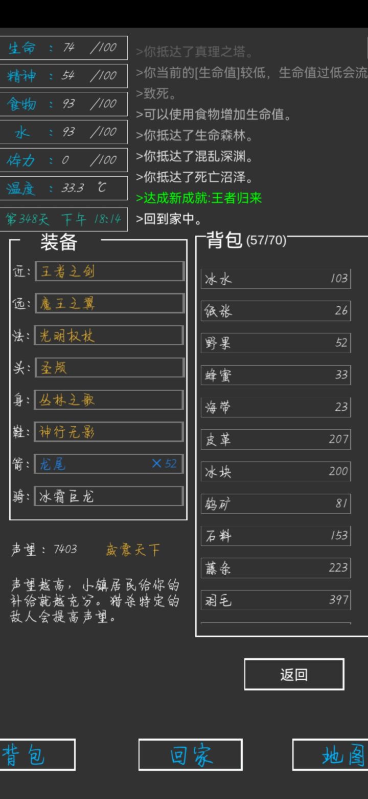 第337天,全成就,全身神装完成😁一些小攻略:前期疯狂探索采矿,拿资源,升建筑就可以了(骨头可以在矿坑的骷髅矿工身上打,一个怪掉五个骨头)。等到祭坛刷到魔果直接买,合成嗜血之瞳(伤害高,材料便宜)就能刷大多数图了(后退➕魔法几乎可以无伤刷图)。在龙谷可以刷巫师入门的书升一升技能,不过要小心冰霜巨龙伤害很高。防御的话可以做个鲨鱼甲(主要是材料好得,防御高,性价比高)就能打过最后的五个BOSS。当然,有收集癖的同学可以和我一样通关后再刷满成就满神装。