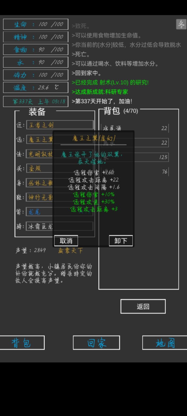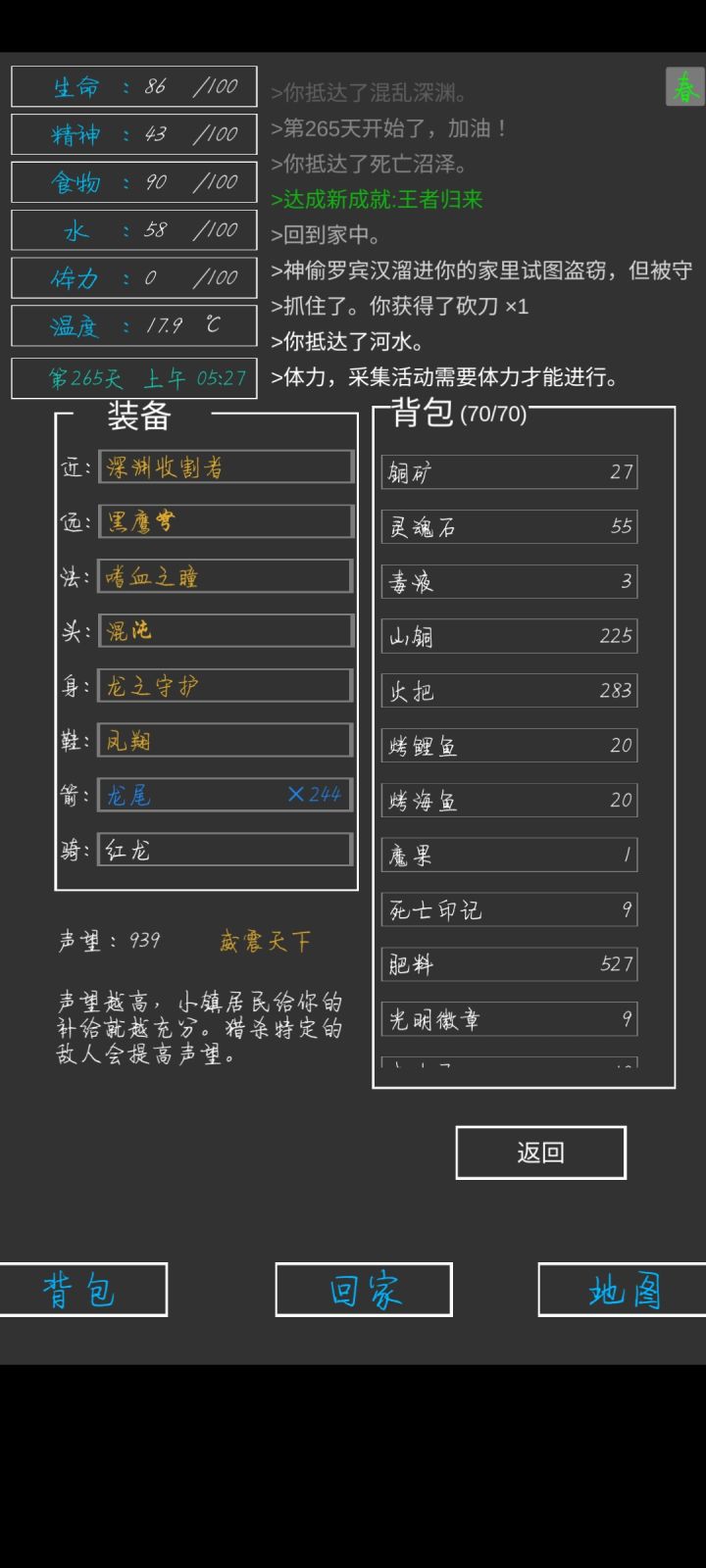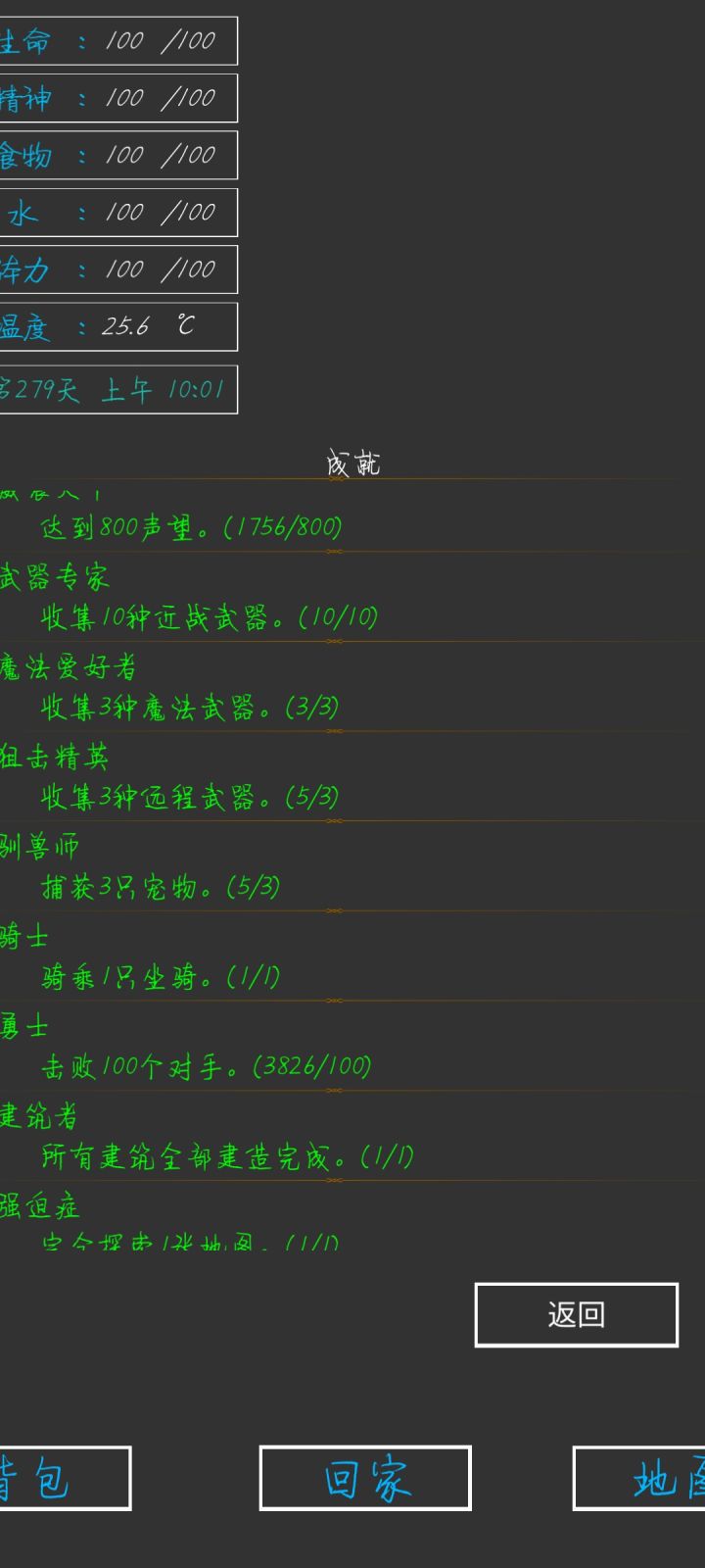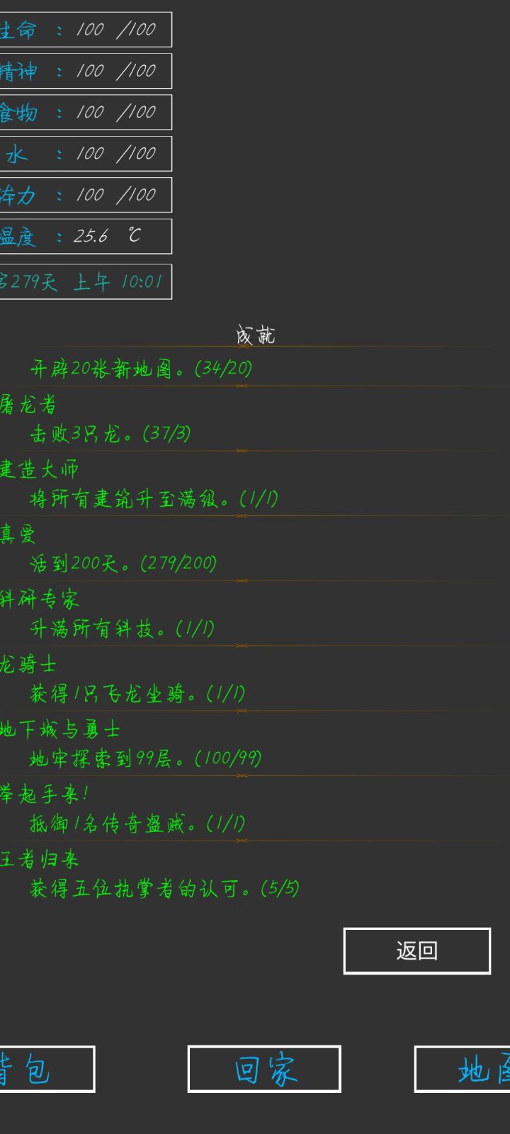 第337天,全成就,全身神装完成😁一些小攻略:前期疯狂探索采矿,拿资源,升建筑就可以了(骨头可以在矿坑的骷髅矿工身上打,一个怪掉五个骨头)。等到祭坛刷到魔果直接买,合成嗜血之瞳(伤害高,材料便宜)就能刷大多数图了(后退➕魔法几乎可以无伤刷图)。在龙谷可以刷巫师入门的书升一升技能,不过要小心冰霜巨龙伤害很高。防御的话可以做个鲨鱼甲(主要是材料好得,防御高,性价比高)就能打过最后的五个BOSS。当然,有收集癖的同学可以和我一样通关后再刷满成就满神装。