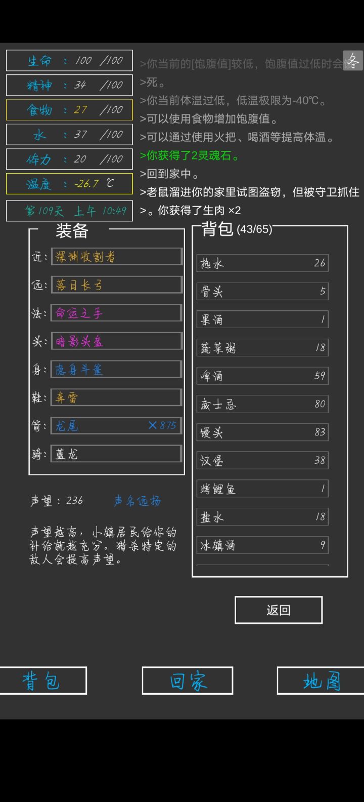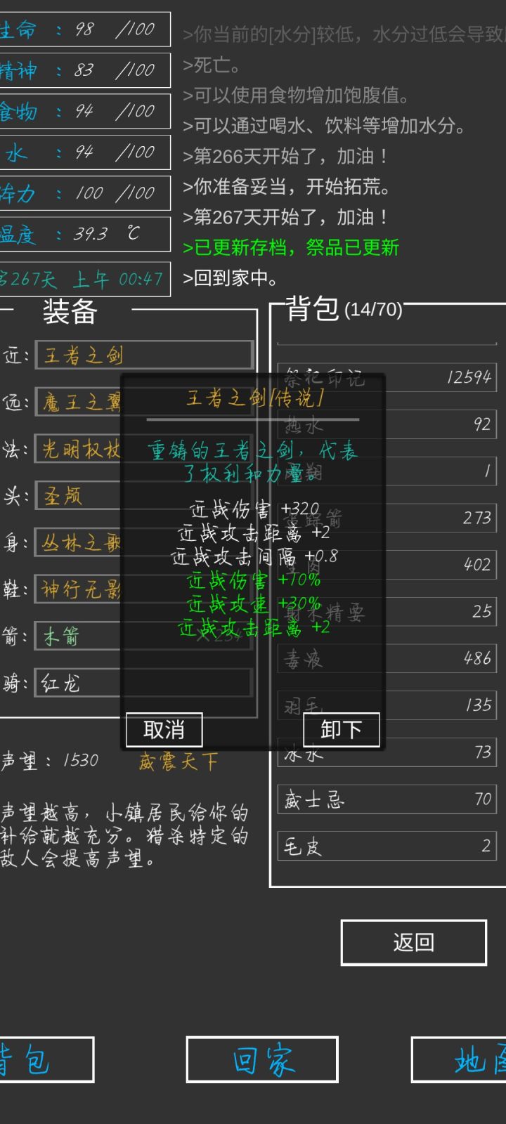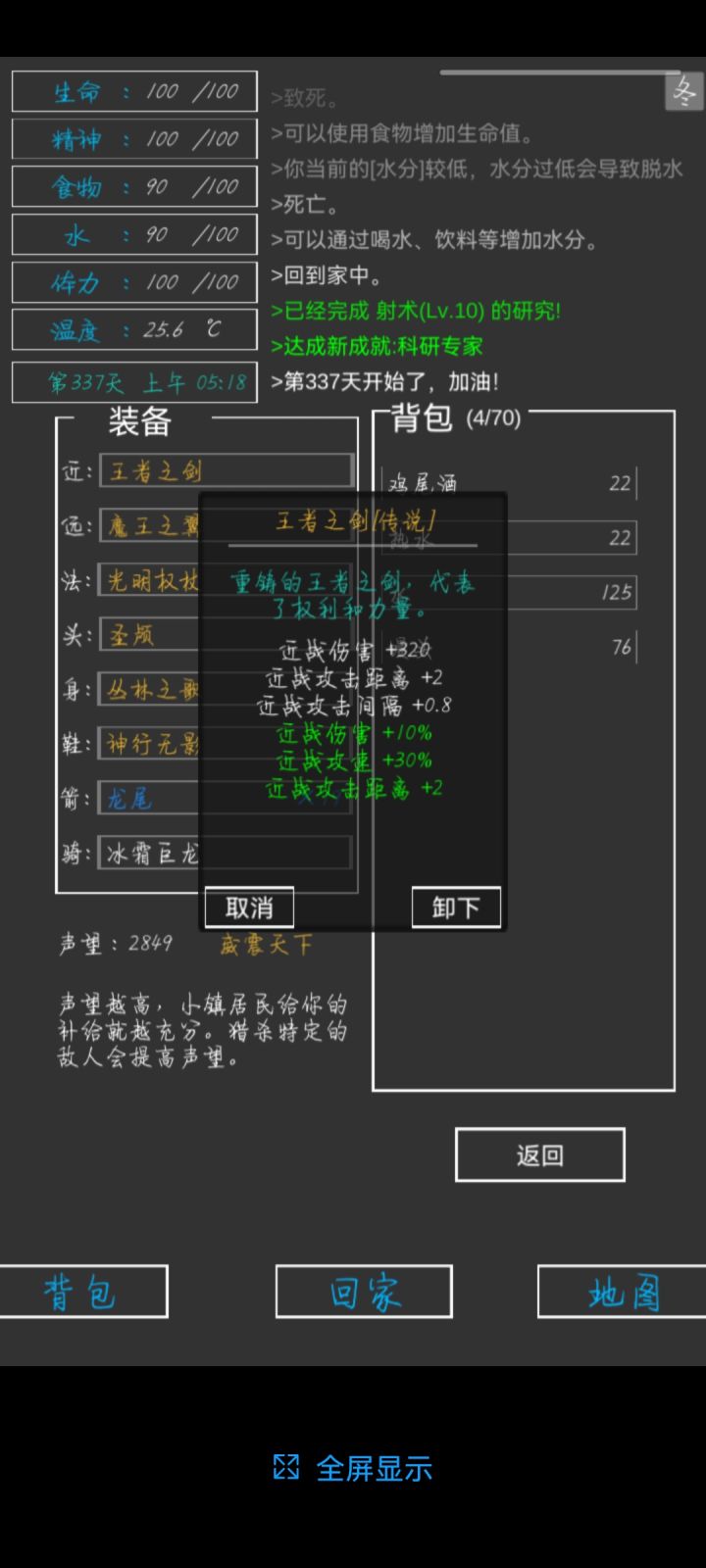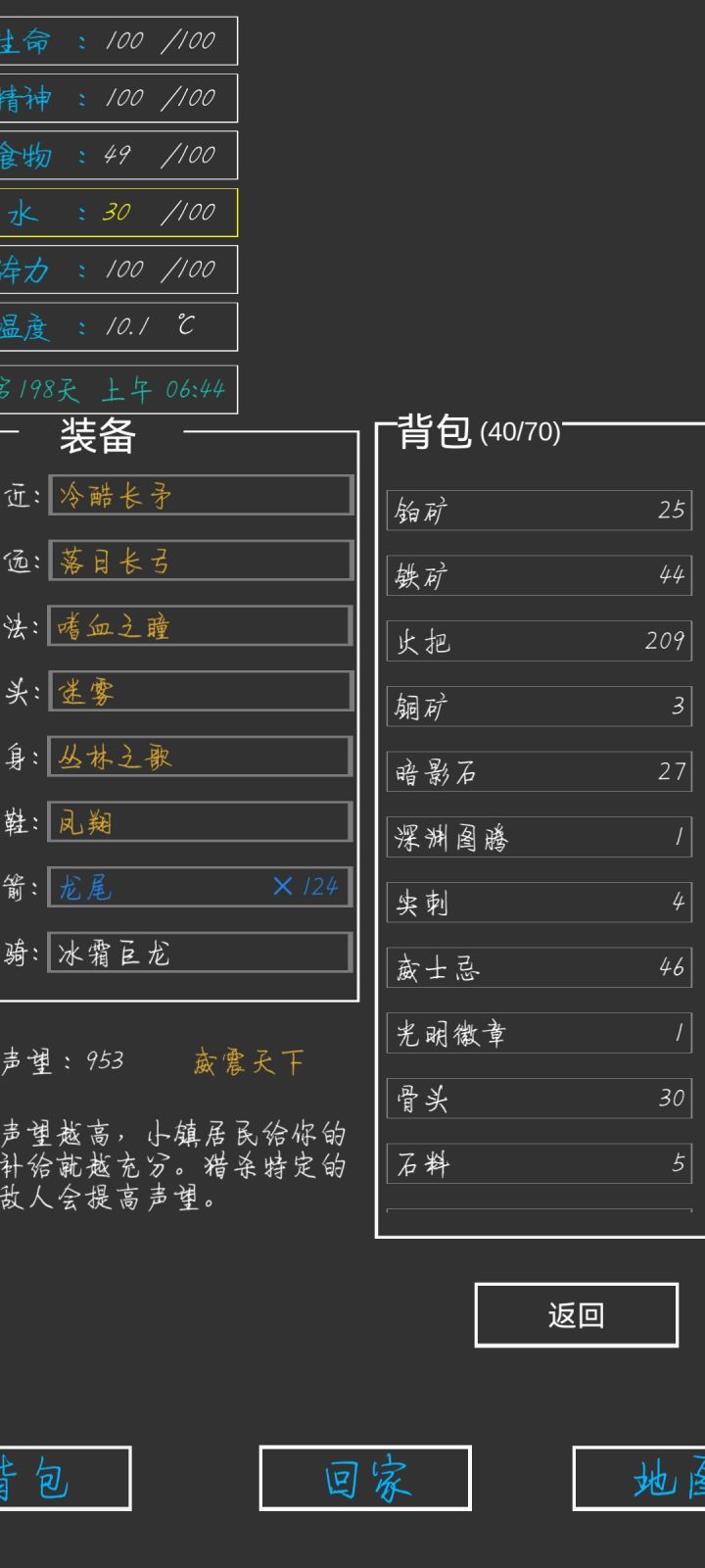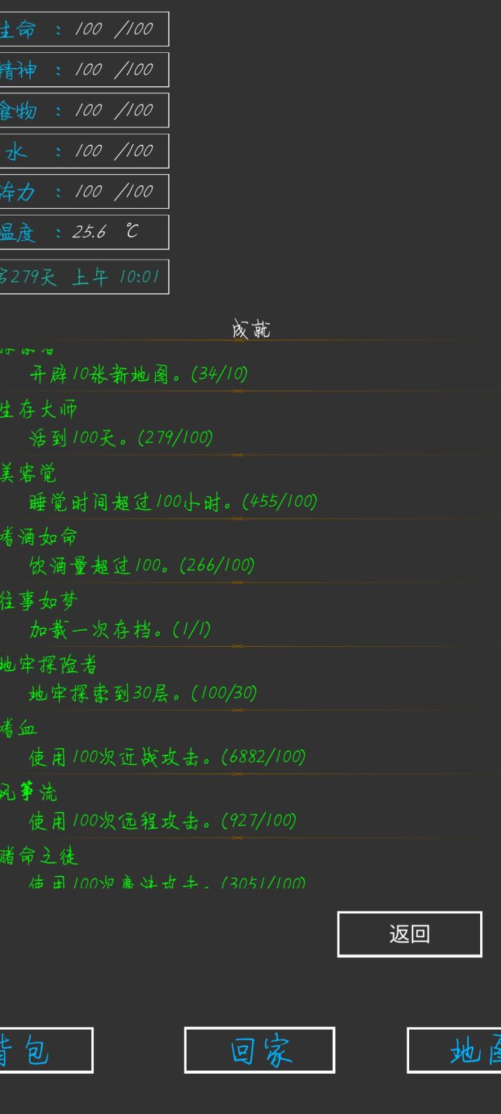 第337天,全成就,全身神装完成😁一些小攻略:前期疯狂探索采矿,拿资源,升建筑就可以了(骨头可以在矿坑的骷髅矿工身上打,一个怪掉五个骨头)。等到祭坛刷到魔果直接买,合成嗜血之瞳(伤害高,材料便宜)就能刷大多数图了(后退➕魔法几乎可以无伤刷图)。在龙谷可以刷巫师入门的书升一升技能,不过要小心冰霜巨龙伤害很高。防御的话可以做个鲨鱼甲(主要是材料好得,防御高,性价比高)就能打过最后的五个BOSS。当然,有收集癖的同学可以和我一样通关后再刷满成就满神装。