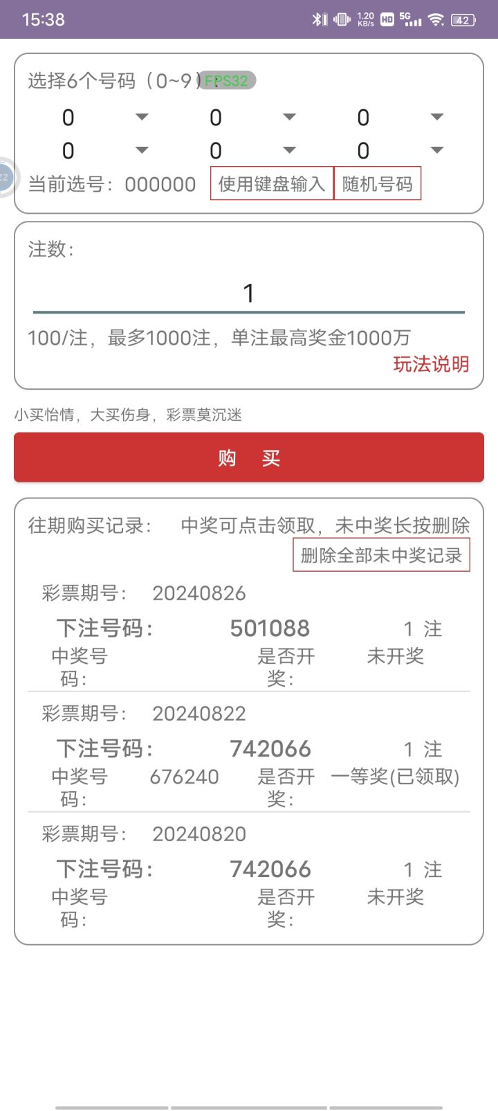 尝试性随便买了几注吧,中了一等奖110000貌似好像是记不清了(?)现实中能不能也有这个运气