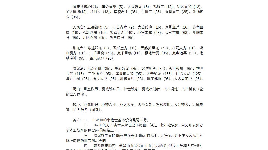 这个游戏主要就是升级和抓宝宝其次是装备的提升 属性点不用多说 防御和玄防对点 技能点是地灵武防地灵玄防 圣微之灵 子龙噬力 永生之血 制裁神域 两仪剑法 刃甲反伤 真言心经 天武功 天玄功 点满 接下来是宝宝抓捕顺序 死神螂-憋龙-魍魉-岩石精-黑暗皇帝-猕猴-血影杀手或角魔-太古始魔-黑暗君王-地宫雷霆或三千星魂-天宫雷霆或九天星魂-魔宠岛95万随便一个都行(五头天龙最好)-蜀山115万随便