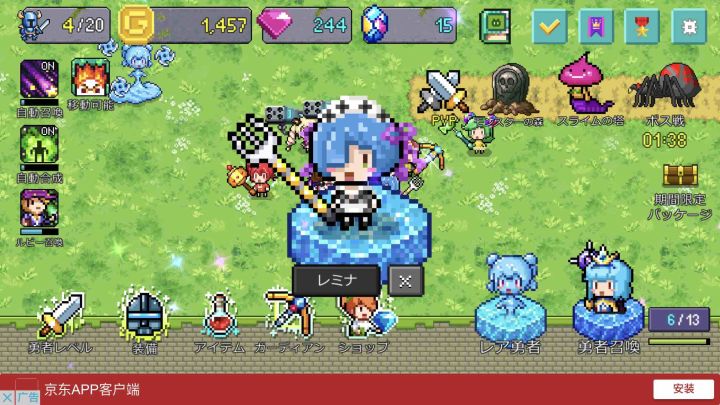一开始先刷中间那个一级,不出就删应用数据重来召唤率上升点到三级以上剩下的红钻都点炼金缩短时间,红钻推进关卡首通会送,彩钻打死每十关的史莱姆BOSS给一颗,炼金每次会给一颗彩钻和几颗红钻。每十分钟来的BOSS首杀送二十红钻,四十杀送150,100杀送700。每个BOSS只能领一次击杀数奖励。5红钻可以开启新的BOSS。彩钻开启稀有勇者用,50彩钻抽取一次。初期开荒优先攻击力高的,普通勇者拿