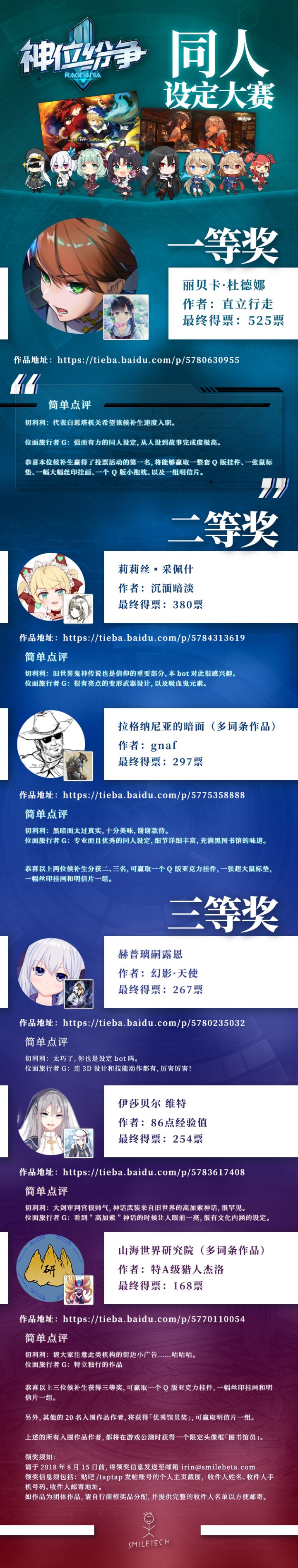 经过了评委们的评选和玩家们的人气投票,我们很高兴地迎来了首届神位纷争同人创作大赛的最终评选结果。有关各作品链接,可至公示微博,贴吧或 TapTap 浏览!领奖须知:请于2018年8月15日前,将领奖信息发送至邮箱 【irin@smilebeta.com】领奖信息须包括:贴吧/taptap发帖账号的个人主页截图(验证身份)、收件人姓名、收件人手机号码、收件人邮寄地址。如作品为团体作品,请自