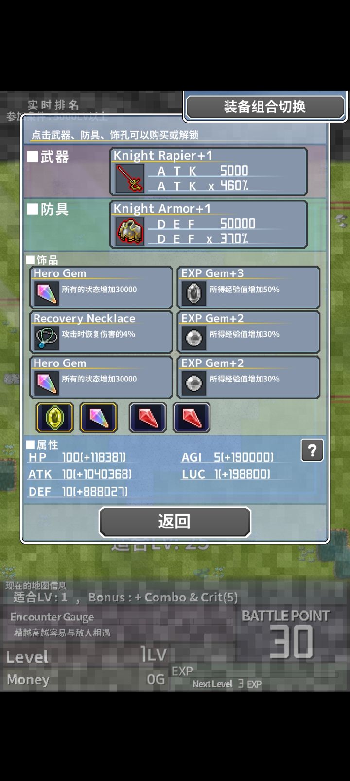 玩了一天打到一万多级卡住。看了一下大佬说要在2222刷吸血,大概半个小时刷了两轮掉了两个吸血和一个加连击的手镯。出门(带3个加经验)先往上走打750级的boss,(血和防对半点)打完继续往上把2300的boss打了,这个时候步数还有30步左右。(换成加幸运+一个加移速;这时候开始全点幸运)然后再回到出生点往右走,2到3步走到2222开刷。这个地方有三块,左上(1333),右上(1222),下(
