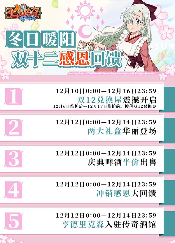 冬日暖阳,双十二感恩回馈。《七人传奇:英雄集结》双十二活动即将豪华开启。双十二兑换屋已与昨日震撼开启,金、薇薇安、吉尔桑达等超人气SS角色限时兑换,机不可失!同时双十二两大礼盒倾情奉上,最多可获赠钻石*12121的超级大奖!让我们跟随小编看看具体有哪些活动吧。【双十二感恩回馈 五重福利大赠送】【活动一】12月10日0:00至12月16日23:59,薇薇安、吉尔桑达等超人气角色加入兑换屋。【活