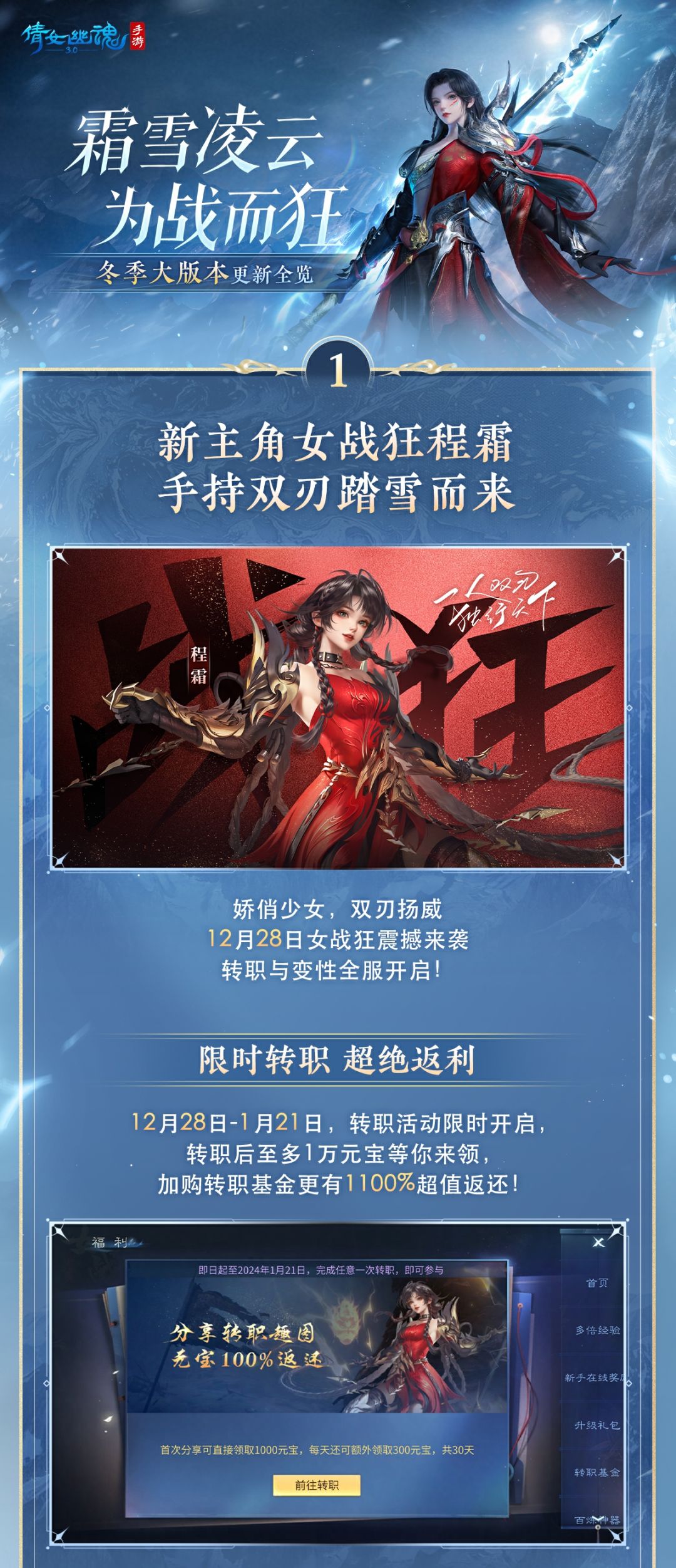 要说当下什么事情最重要,便是12月的大版本更新!本次的更新重点包括但不仅限于: ★女战狂将于12月28日热血上线! ★全新冬日时装上线,霸气狼系坐骑登场! ★冬日活动欢乐开启,全新炫彩家具亮相三界! ★新场景[天工阁秘境]开启,为你诠释墨家机关术! ★征海荡寇全新启程,新装备部位携新锻造套装来袭! ★转职活动限时开启,加购转职基金更有1100%超值返还。 ★百炼神器活动携限定称号、坐骑、支机石等豪