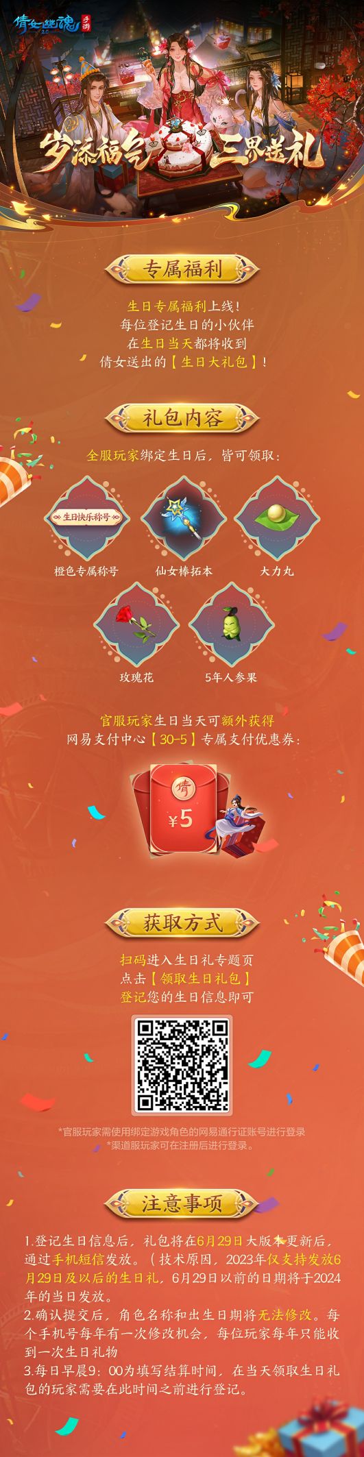 每年519周年庆,菌菌都会收到小伙伴们对倩女的生日祝福,总是十分感动; 这次反过来,我们要给所有小伙伴,送上倩女er专属生日大礼包!伴你年年岁岁,朝朝暮暮! 来生日专题页登记你的生日日期,今后每年生日当天,小伙伴们都将100%收到生日祝福短信,以及一个生日大礼包!包含橙色称号【生日快乐】、仙女棒拓本等珍贵游戏道具,以及官服玩家专属的支付优惠券! *礼物将在生日当天以兑换码形式通过短信发放