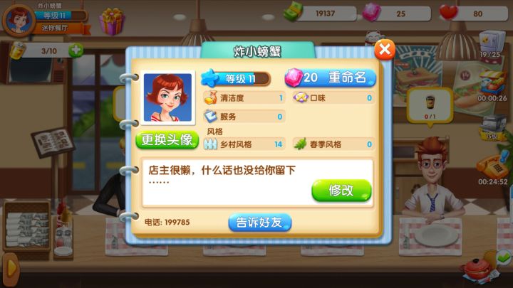 《我的梦餐厅》的好友系统可以让你结交更多的小伙伴,各位餐厅老板可以互相参观彼此的餐厅,可以互送礼物,好友的厨房还会有神秘小礼物等着你。为了方便各位餐厅老板互加好友,特开一个官方帖,想互加好友的小伙伴,可以在本帖留言,寻找有眼缘的餐厅好友哦~当然,也非常鼓励各位老板老板娘去论坛发帖征友~留言格式仅供参考,各位老板可以自行发挥哈哈~游戏内电话:1000XX(点击左上角头像,可以查看各位老板的电话