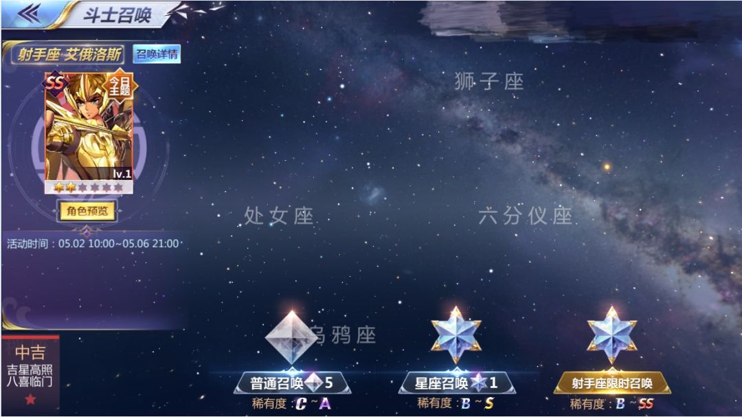 首个SS,射手座·艾俄洛斯将在5月2日降临圣域,同时在2018年5月2号10:00~5月6号21:00将会开启射手座限时召唤活动,召唤界面会开启新的限时卡池。 什么是限时卡池? 限时卡池是独立在目前我们已知卡池之外的新卡池,使用的仍然是高级星石,没有新增的召唤道具。 本次限时卡池中含有的角色,都是精选的十二宫剧情相关的斗士,比如,深受大家喜爱的3星、4星级B卡,也有机会在限时卡池中抽到。当然,重头