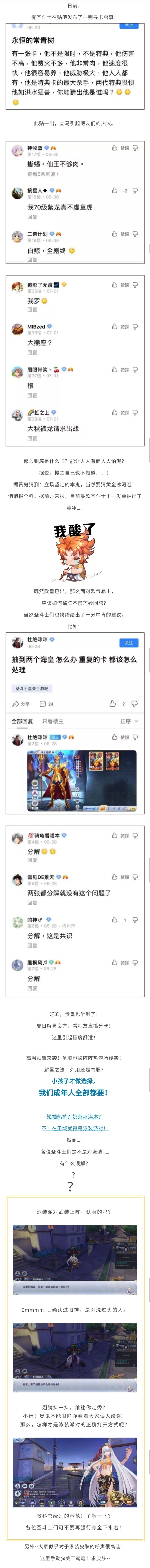 观众朋友们晚上好, 欢迎收看本周的《圣域周报》 首先我们来看一下本周都有哪些新闻: 寻卡启示引热议,圣域常青树到底花落谁家? 面对欧气暴击,应该如何临阵不慌巧妙回怼? 泳装派对武装上阵,是道德的沦丧还是人性的扭曲? 寻卡启示引热议,圣域常青树到底花落谁家? 本期话题 你眼里的圣斗士常青树是? 本周的《圣域周报》到这里就结束了,感谢您的收看!各位圣斗士如有任何爆料,在评论处给贵鬼留言哟~