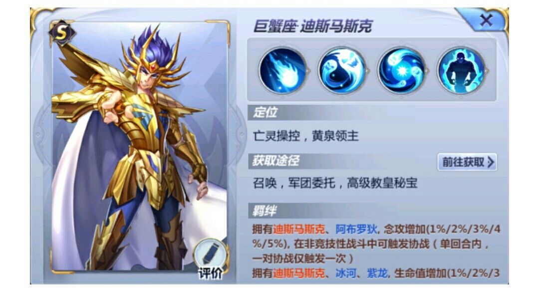 CV:谷山紀章 资质:S 定位:亡灵操控,黄泉领主 世界观 在《圣斗士星矢(腾讯)》手游中,巨蟹座的黄金圣斗士迪斯马斯克,拥有操控亡灵的能力,通过愚弄死者来获取力量,并且可以通过汲取黄泉之力做到短时间多次行动,能输出能回复,是一张全能卡牌,唯一不足是需要有足够的死者作为祭品。 技能解析 积尸气冥界波 普攻 消耗0费 对1名敌人造成60%(65%/70%/75%/80%)的念力伤害。若场上有圣斗士