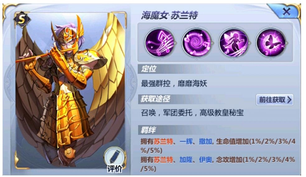 CV:小林裕介 资质:S 定位:最强群控,靡靡海妖 世界观 海魔女苏兰特,是侍奉海皇波塞冬的实力最强的海将军,是守护南大西洋之柱的海将军。 技能解析 靡声 普攻 0费 对1名敌人造成80%(85%/90%/95%/100%)的念力伤害。 死亡高潮 群体控制 4费 使每个敌人有70%(70%/75%)概率( 效果命中)陷入睡眠状态,最多可睡眠3(4/4)个目标(冷却1回合) 女妖安眠曲 被动,深度
