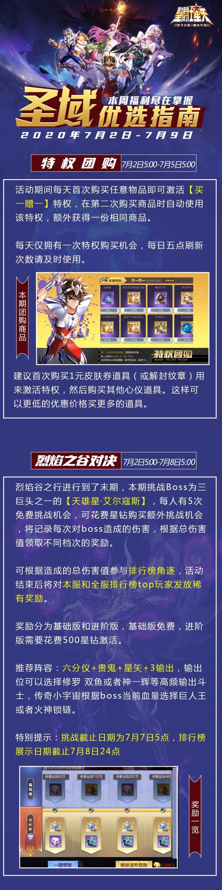 亲爱的圣斗士们:为了给各位圣斗士们带来更好的游戏体验,圣域即将在2020年7月2日凌晨02:00-05:30进行停机更新,开服时间会因实际进度推迟或提前。此次为停机更新,圣域为大家准备了150钻的更新福利,请更新完成后到邮箱查收。【更新时间】7月2日凌晨02:00-05:30【更新方式】停机更新【更新范围】全服1、新增1个传奇小宇宙,不尽木。获取方式:小宇宙商店固定刷新(35级以上玩家有