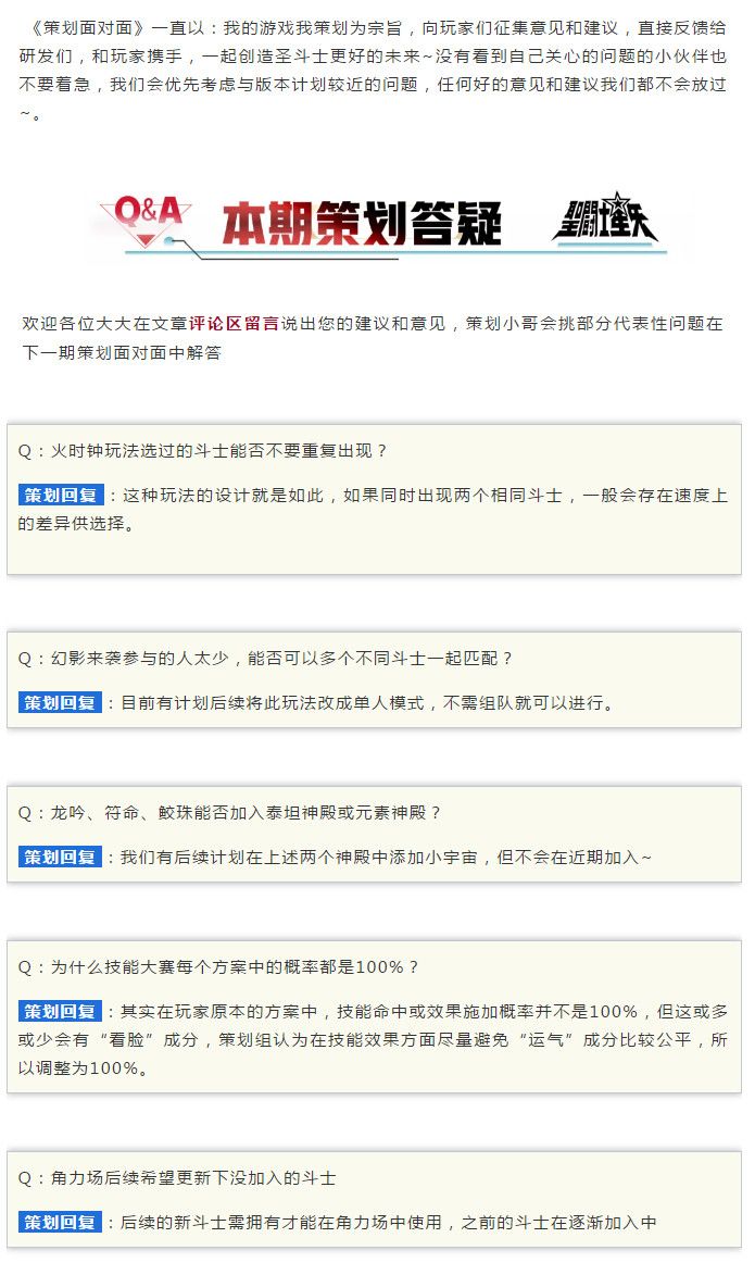 《策划面对面》一直以:我的游戏我策划为宗旨,向玩家们征集意见和建议,直接反馈给研发们,和玩家携手,一起创造圣斗士更好的未来~没有看到自己关心的问题的小伙伴也不要着急,我们会优先考虑与版本计划较近的问题,任何好的意见和建议我们都不会放过~。