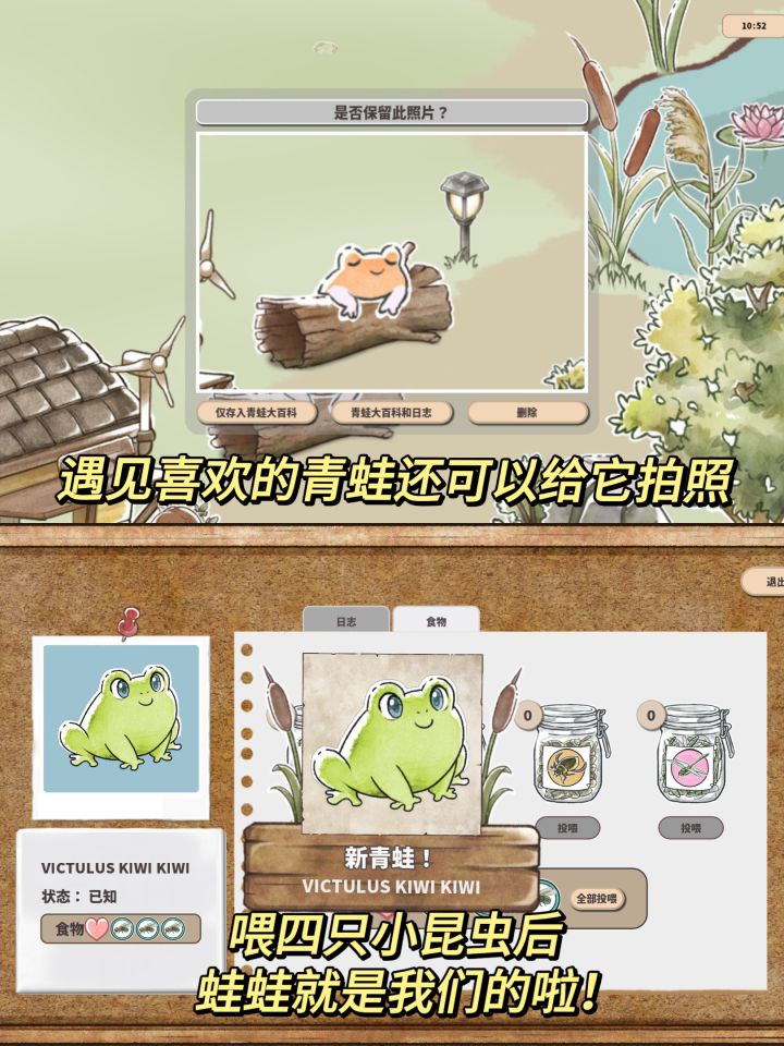 游戏:Kamaeru: A Frog Refuge平台:Steam 刚刚推出demo的养小青蛙游戏!玩了一小时后就立刻沦陷了,太太太太可爱了 游戏的玩法偏休闲放置,一点也不肝,我们只要建好池塘和芦苇、浆果……然后等待它们成熟后一键收获就可以了! 接下来把收获的果实做成棒棒糖或者果酱等等,卖给商店,就可以给小青蛙们买各种好看的家具啦! 这些家具就会吸引越来越多的青蛙,