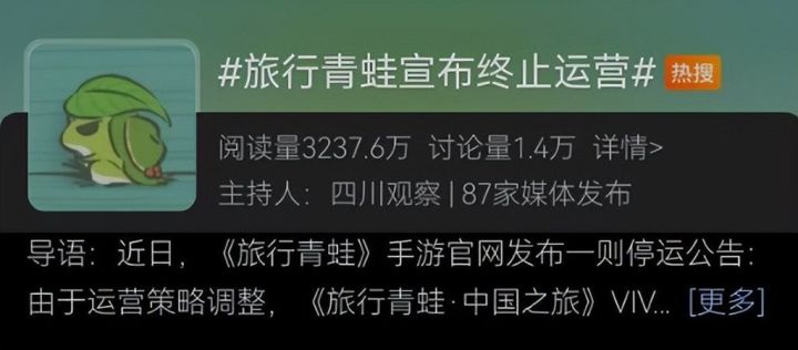 #今天游戏圈发生了啥 #资讯评论员 #旅行青蛙 谁能料到,那只背着荷叶帽子的小青蛙,近日竟因渠道服停运一事登上热搜。虽玩家可将“呱儿子”转到官服,但评论区满是“爷青结”的感慨。而公告中透露开发团队仅剩五人、社区运营集体躺平的信息,更似给这款佛系游戏下达了“病危通知书”。 2018年,《旅行青蛙》横空出世便创造了惊人奇迹。上线首月下载量超2000万,最高日活达763万。游戏玩法简单却别具魅力: