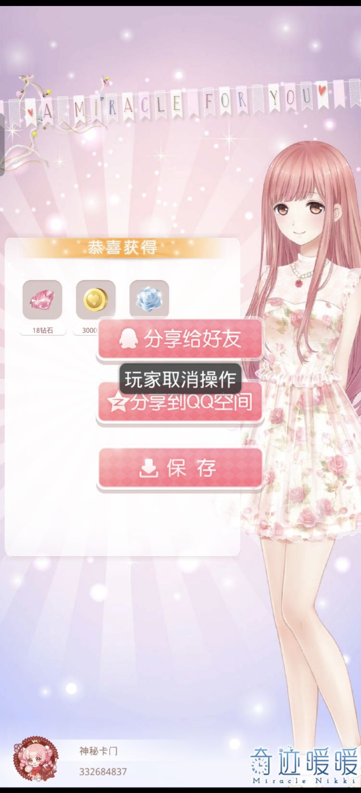 不知道为什么,跳到QQ分享完成后,再自动回到暖暖,明明已经发送成功了,还会显示玩家取消操作,然后分享不成功。试了七八次了,都不行,暖暖也关了重启了,还是不行,烦躁到想吐。