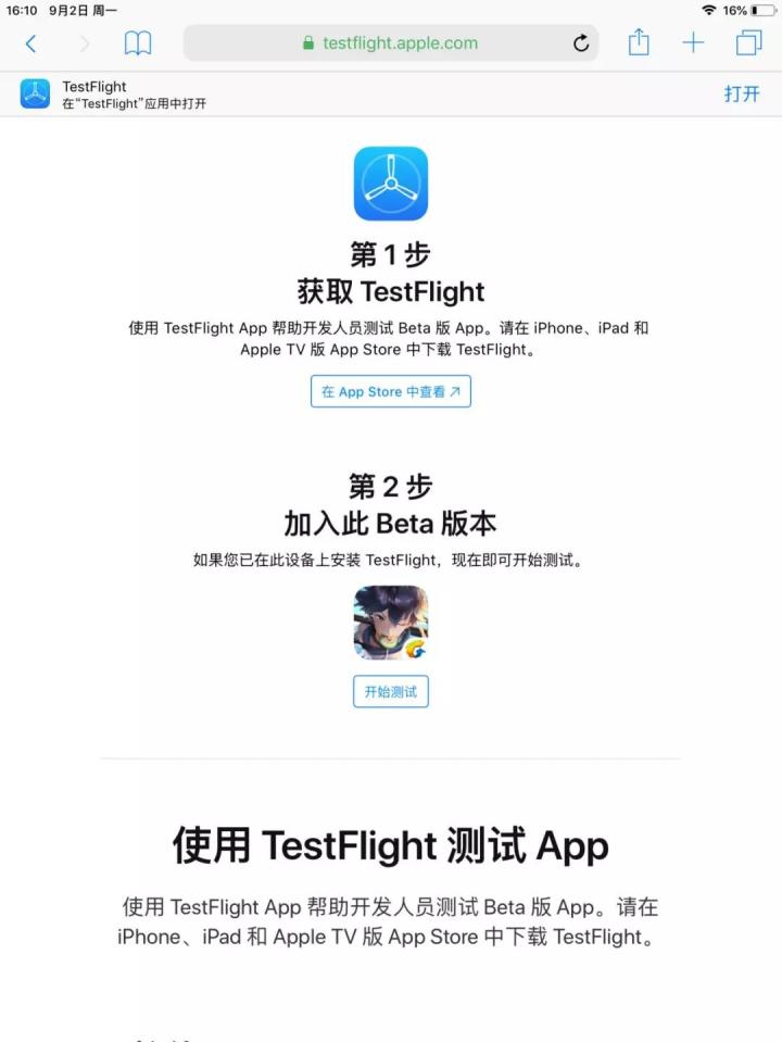 成功获得本次iOS测试资格的玩家,将收到获得资格的短信,TapTap用户会收到站内信哦~请各位玩家使用iOS设备打开附带链接,并点击链接进入如下所示页面:第一步:在App Store中下载安装TestFlight,也可通过页面中的按钮直接访问App Store下载安装。如果此前设备已安装TestFlight,则跳过此步骤。第二步:安装TestFlight后,重新点进您收到的短信中的链接,打开