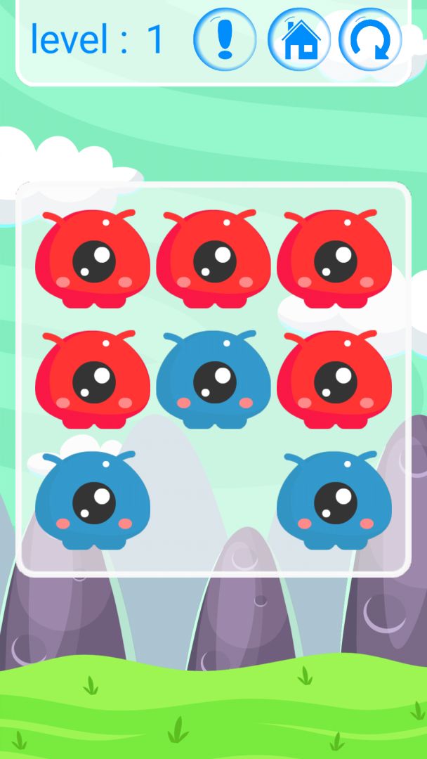 操作:点击一只精灵,如果周围有空位,那就向这个空位移动。精灵移动后,那这个精灵跟它接近的精灵都会改变颜色。