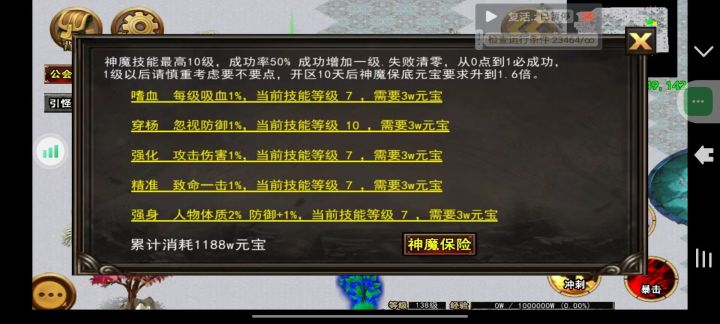 花元宝在冰雪'独孤败天'升级一下神魔,3万一下,欧皇1000多万就能弄满38,正常是一亿多,满38后期可以去冰川地图打,满10开个20万元宝的狂暴可以去'孤独之地'一层打,一层到五层爆率一样,只是免骚扰
