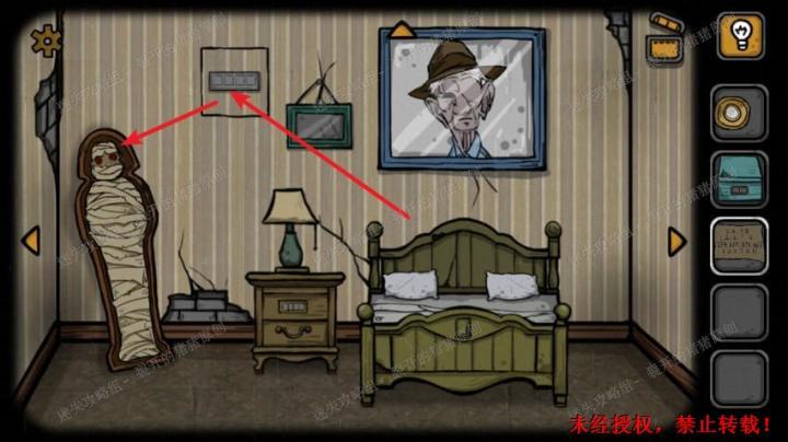 💖《被遗忘房间的秘密》攻略💖💖第一关💖1.画面一开始我们就已经在房间中了,我们先点击左边的法老棺材,看到里面有一具木乃伊,之后点击墙上的肖像画在右眼处拿到镜片,接着在床上枕头下方拿到一个盒子,把被子掀开后拿到一张密码纸。1.12.密码纸上少了四个数字,通过找规律我们知道秘密为6815,用密码打开左上角嵌在墙里的箱子,拿到一把剪刀,用剪刀把木乃伊头部的绷带剪开拿到脑子以及绷带。2.13.接着