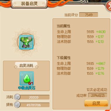 神兵利器,往往需要经过打磨才能展现最强的实力。一件初始的装备,经过重重强化,才能变成终极神装。一、升级每隔20级,可以升级一次装备,通过消耗银币以及材料,把装备提升到更高的等级,也可以直接在商店购买适合当前等级的装备。因为需要初始获得的装备都没有特效的,所以后续可以通过打造获取更好的装备进行替代。二、启灵1、启灵就等于灵属性的强化,不同等级的装备有不同的强化上限。且启灵有成功率,达到一定次