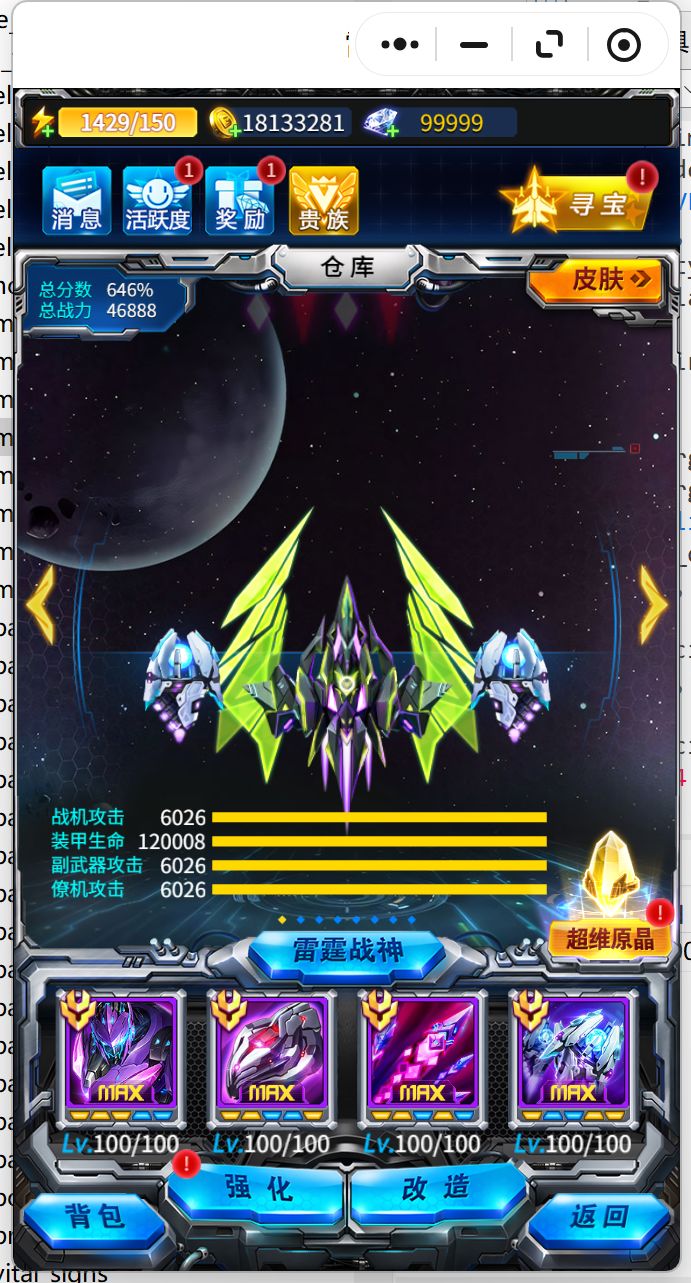 #雷霆战机首发创作征集令 去了论坛看一圈对黑子忍无可忍了才写这批攻略 正好回归玩了APP加小程序两个月,图片为证,作为零氪,冰河领主养的还行吧 注意,不要拿钻石抽宝箱! 不要拿钻石抽宝箱! 不要拿钻石抽宝箱! 你是氪佬钻石几十万请随意。但咱们作为萌新和微氪钻石的用途只有三个: BOSS模式买次数(解锁最高难度后) 光辉祈愿(活动开放) 新战机发布时专属抽奖活动(几千钻石+活动保证拿下最新的紫色S
