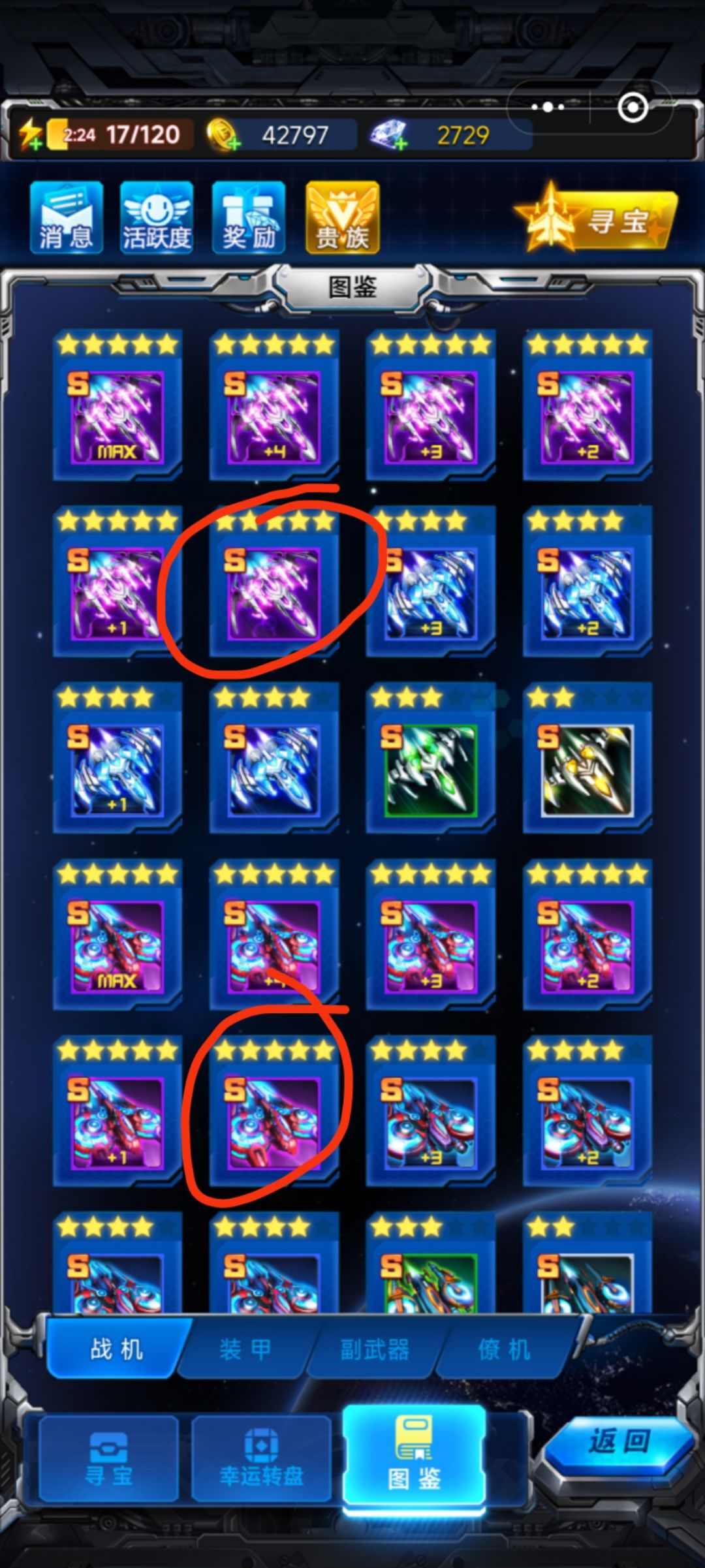 萌新游戏前期攻略: 1.装备用什么,需要无脑用s吗: 先说一下装备分类,这游戏分为战机,装甲,僚机,副武器四类,拿当前版本为例,每类目前有6个不同的装备,点开图鉴,从上往下数分为1线一一6线装备,拿战机举例,s曙光就是1线,s异形就是2线,超级氪佬可以抽奖无脑s,平民微氪玩家不要无脑s,因为前期s爆率很低,你养不起,会卡战力打不过副本,前期就是金钥匙抽到什么紫就优先玩哪个,先保证四个装备栏都有紫