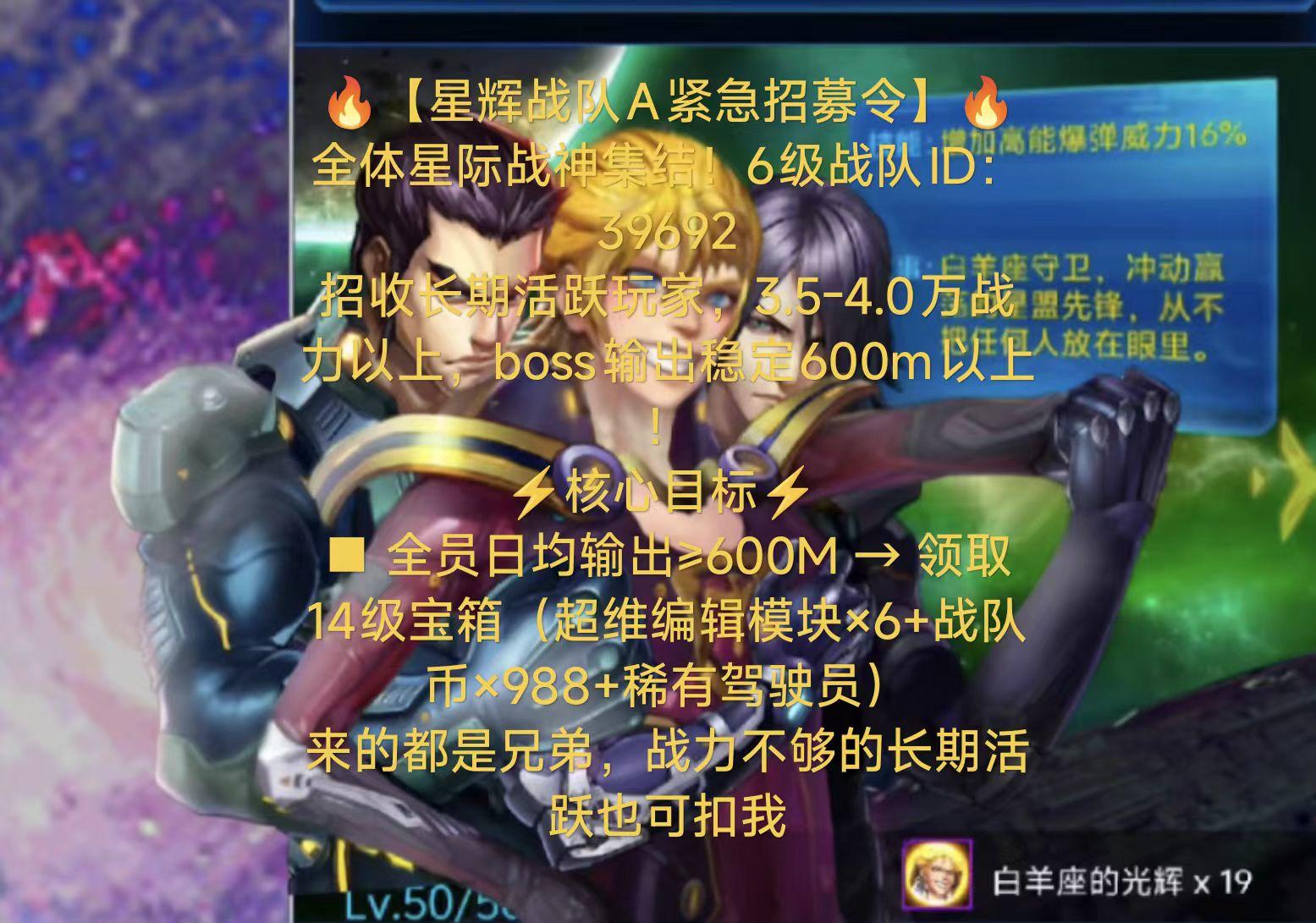 战队招人,本周已经拿满全部奖励,欢迎日伤害850+的大佬加盟,每周伤害前10,有现金奖励,平时也会抽月卡,外加今天会抽10张月卡,还有3个位置,有意向的兄弟加我现已加码,凡是今天进队的,可以领10米的红包,下周一发