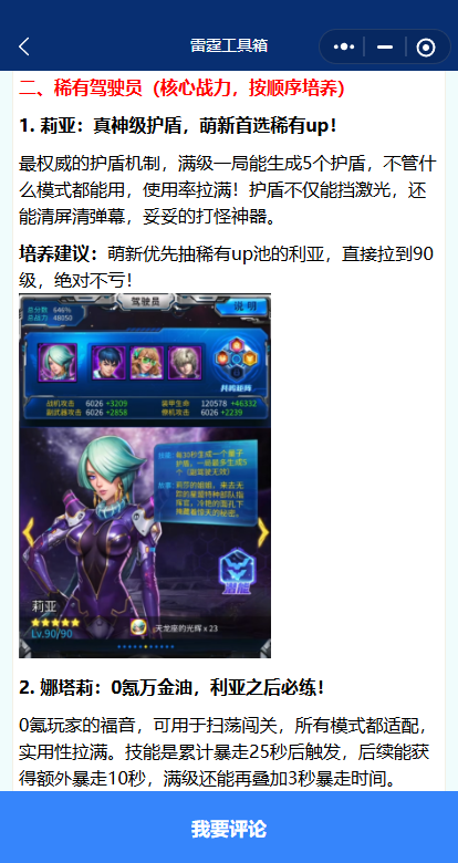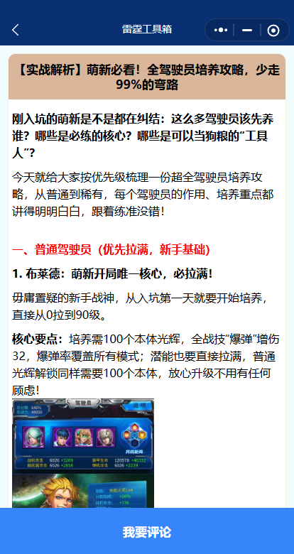 机长大人们,晚上好。这里是「王牌驾校」,我是你们的飞行教官莉莎。真正的王牌机师,不仅要学会驾驶战机,更要懂得如何唤醒并驾驭蕴藏于钢铁躯壳中的战神之魂。莉莎的使命,是成为各位的领航员,为你们点亮清晰的成长星图,助你跨越每一道战力门槛,最终成为能定义战场规则的星海战神。人外有人,天外有天!我们更鼓励各位机长大人分享自己的新手攻略与实战心得,让更多新晋飞行员在星海征途上少走弯路~ 下一期,您希望