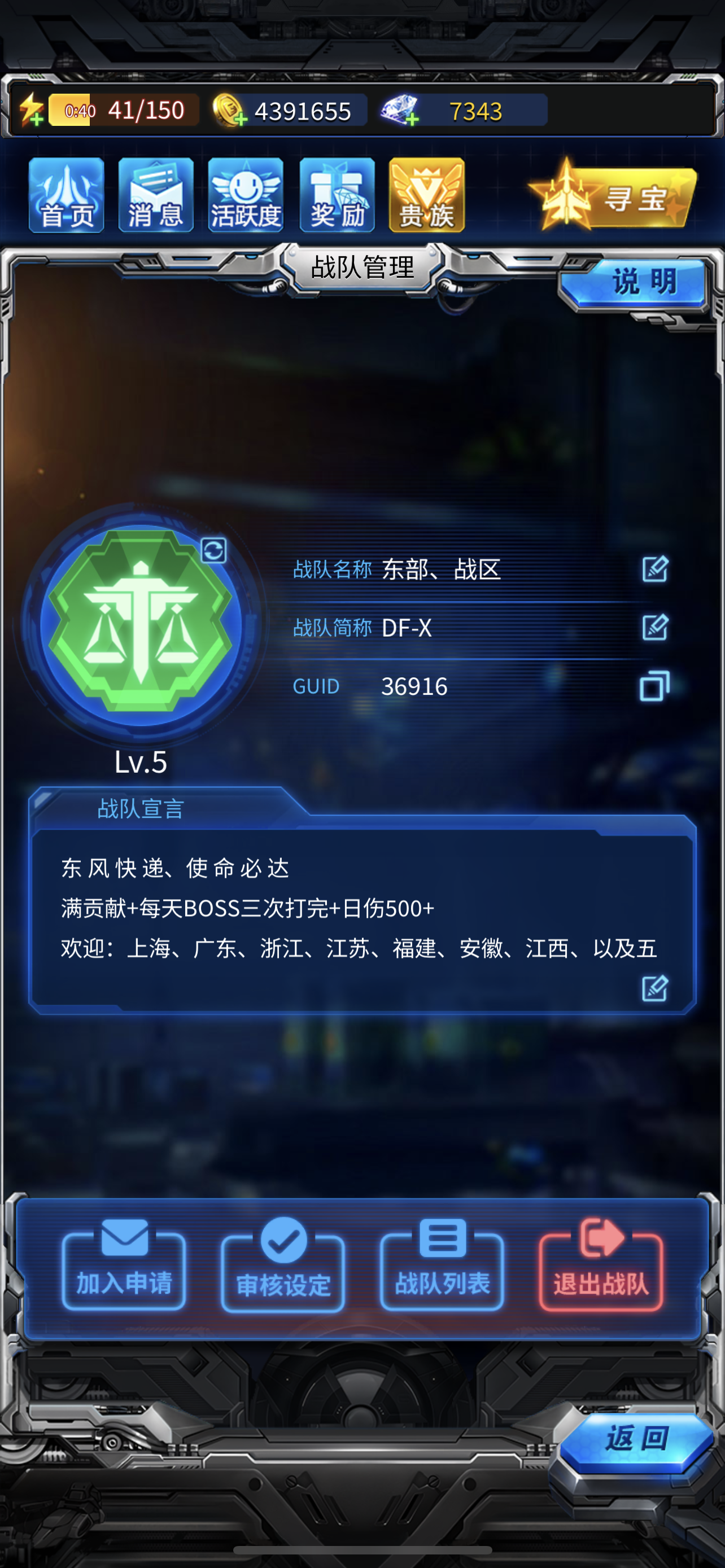★战队名称:东部、战区★战队GUID:36916★战队等级:5级(下周6级)★战队招人要求及简介:满贡献+日伤500M+每日BOSS三次必须打满、3.5万战可以直接加入