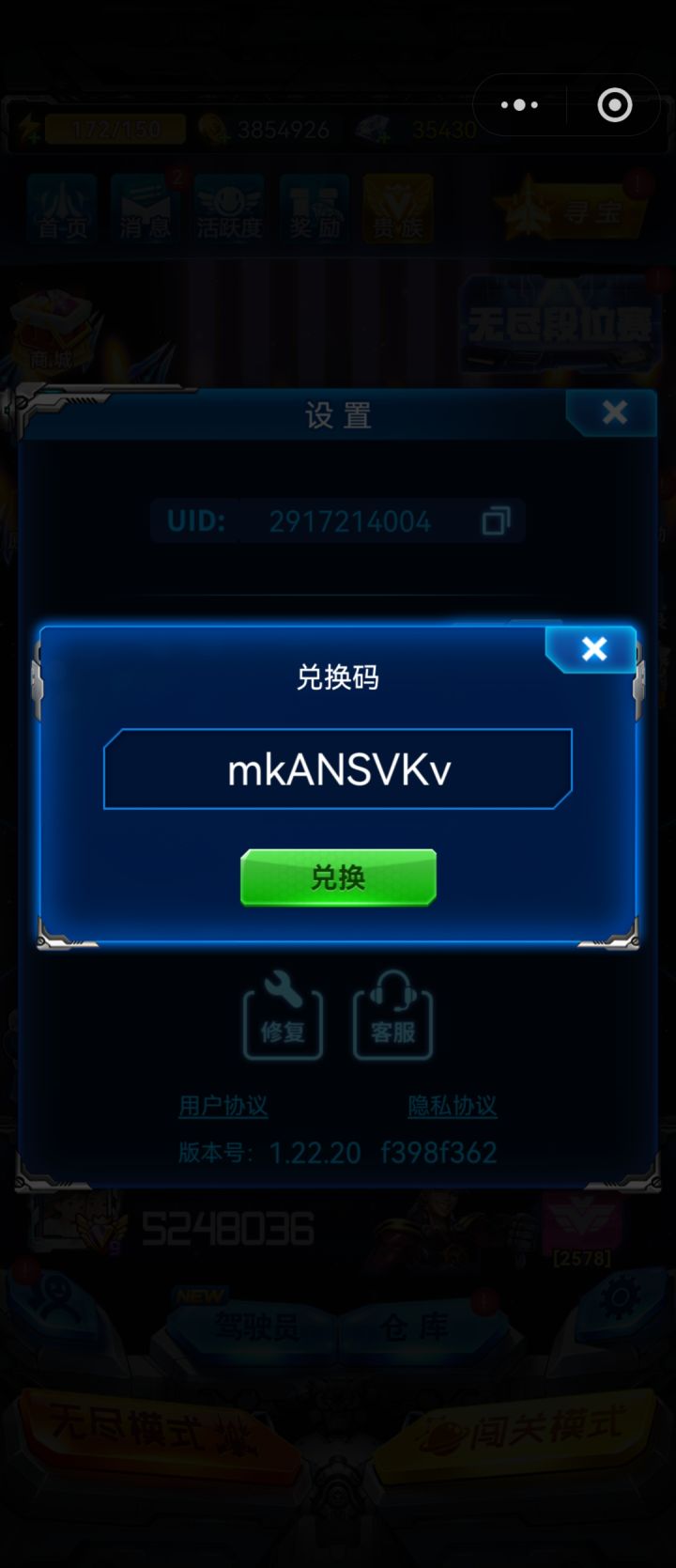 限时无尽场 狭路相逢全力以赴! 多套装切换 灵活搭配各显神通~ 愿大家全力以赴 勇攀高峰冠绝星河! 问鼎星际王牌战神机长, 无尽段位赛~欢迎机长大人们前来体验! 兑换码:BA19a4Fd 内容:66钻石+6爆弹+66体力 截止时间: 2026年4月30日24点 #雷霆战机 #雷霆战机三体联动 #雷霆战机集结