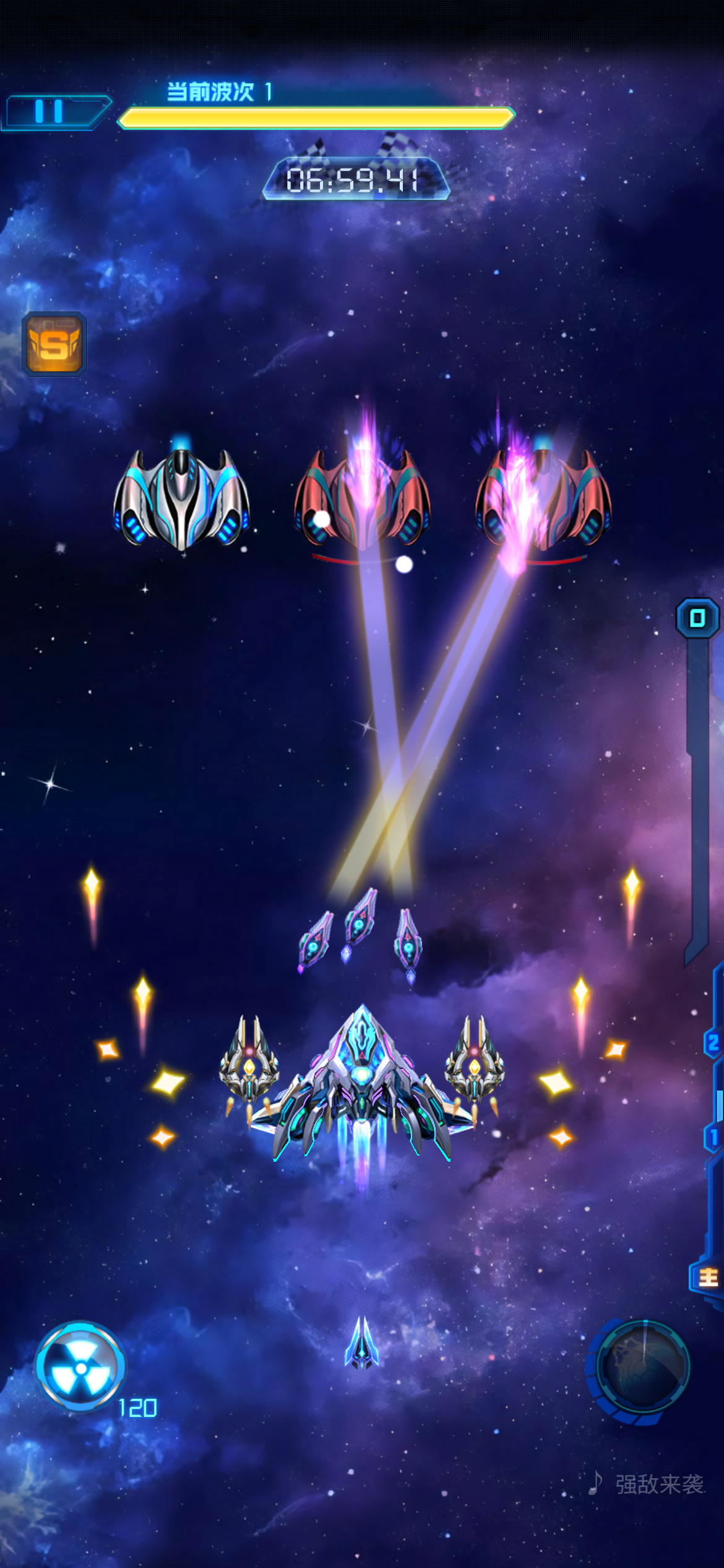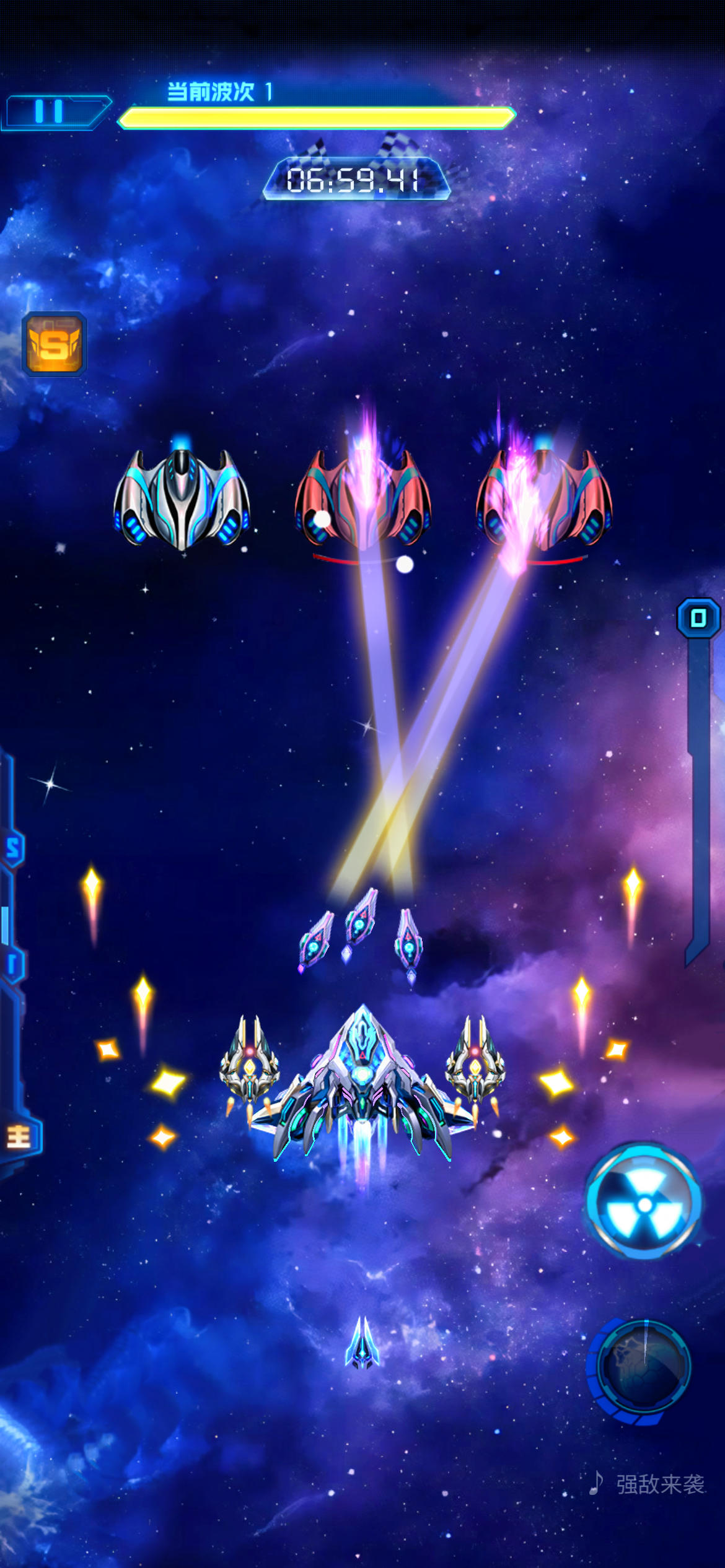 #雷霆战机集结 #雷霆战机集结策划能不能管 咱就说能不能把爆弹的位置改到屏幕的右边,驾驶员技能的上方,如图2。或者干脆出个自定义设置,左或者右二选一。最终兵器的状态放到左边(如图2)和深空巡航等级对面的位置。我想肯定有和我一样用左手拇指或食指操作的吧,炸弹冷却好了看不见或者点炸弹的时候,左手手要离开屏幕去点炸弹,这时候飞机要失去操作,很容易中弹的。