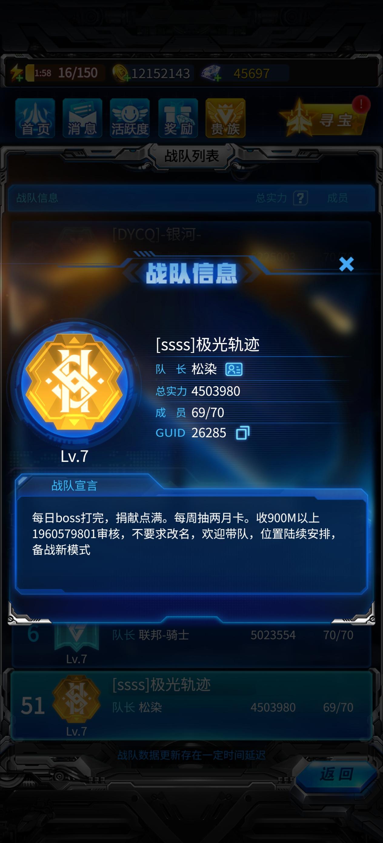 D:25972,稳拿lv15奖励,要求战力>3.5w,每天战队boss伤害>500m,欢迎加入!