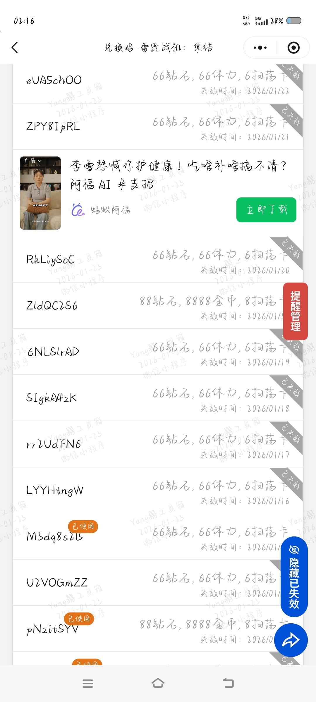 1月1日:EhMkIIQq1月6日:VnRRYTCr1月10日:Wycrgpd91月11日:wMJVTVzE1月12日:u9cV5AEr1月13日:IkWEFylI1月14日:pNzitSYV1月15日:M3dq8s2B12月31日:icUQoB8bdw1dor6A(现在兑换码几乎第2天就过期了哈,过期的我都清掉了)1月19日:ZldQC2S61月22日:3lK3XuHC