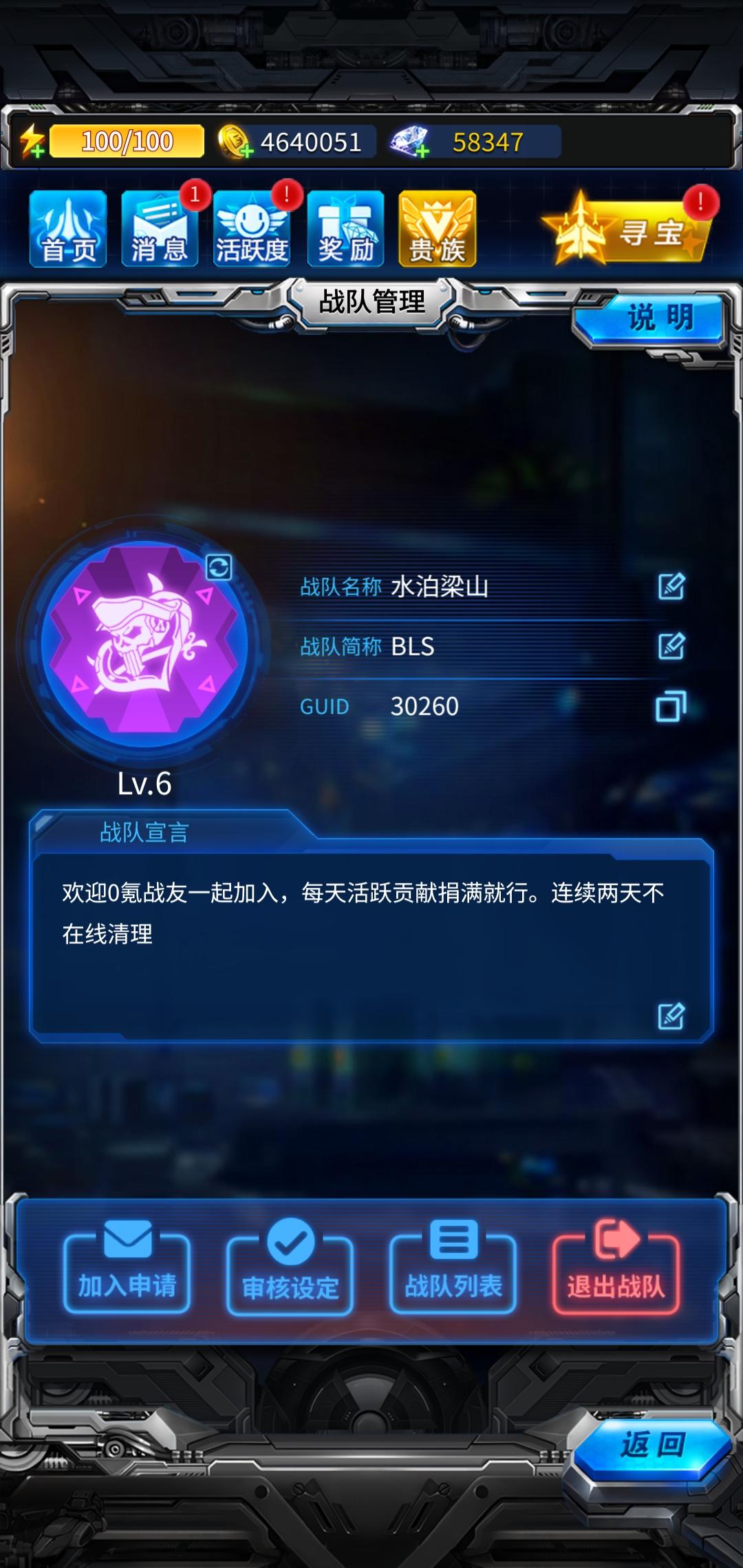 7级活跃战队招募,可以拿满全部奖励!要求每日完成金币钻石捐献、三次战队BOSS征讨!BOSS征讨要求每日700M,战队ID:27419,欢迎机长的加入!