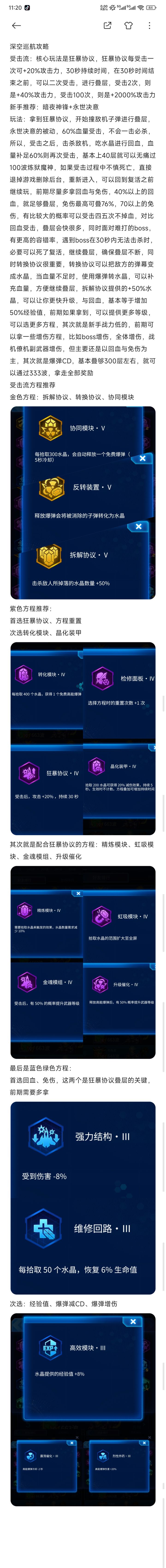 深空巡航受击流玩法,不会的萌新看过来#雷霆战机集结攻略 深空巡航攻略受击流:核心玩法是狂暴协议,狂暴协议每受击一次可+20%攻击力,30秒持续时间,在30秒时间结束之前,可以二次受击,进行叠层,受击2次,则是+40%攻击力,受击100次,则是+2000%攻击力新手推荐:暗夜神锋+永世决意玩法:拿到狂暴协议,开始撞敌机子弹进行叠层,永世决意的被动,60%血量受击,不会一击必杀,所以,受击之后