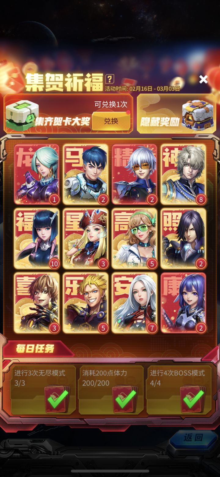现在兑换码有时限哦,几乎有体力的都是第2天到期,即时兑换2月1日:snikBFBo(已过期)2月2日:o8eTfPoJ(月底过期)7DB7sJ43(已过期)2月3日:KAYfN6Ns(已过期)2月4日:L9hYmVjZ(月底过期)5nbqTGzl(2月5日过期)2月5日:8sChNoZg(2月6日过期)2月6日:WhaWTl70(2月7日过期)2月7日:X8V7iEXt(2月8日
