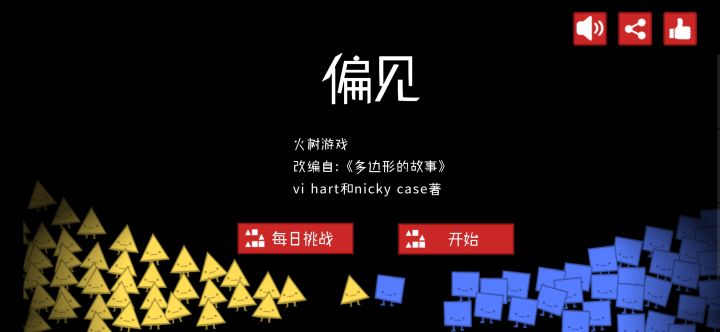 游戏名称:偏见游戏类型:模拟器/ 哲理性游戏游戏介绍:这是一个人性探讨的小游戏,来源干我们的生活,非白即黑的选择是否是你对待这个世界的态度?这款萌萌的分离模拟器借鉴于《多边形的故事》。首先,游戏提出3个问题:1.个人的偏见是否会影响其他人,甚至整个社会? 2.偏见对干双方是否有益? 3.对干一些偏见,我们应该怎么做?然后游戏通过三角形和正方的小故事,揭示了人人之间的小偏差如何导致产生偏见,