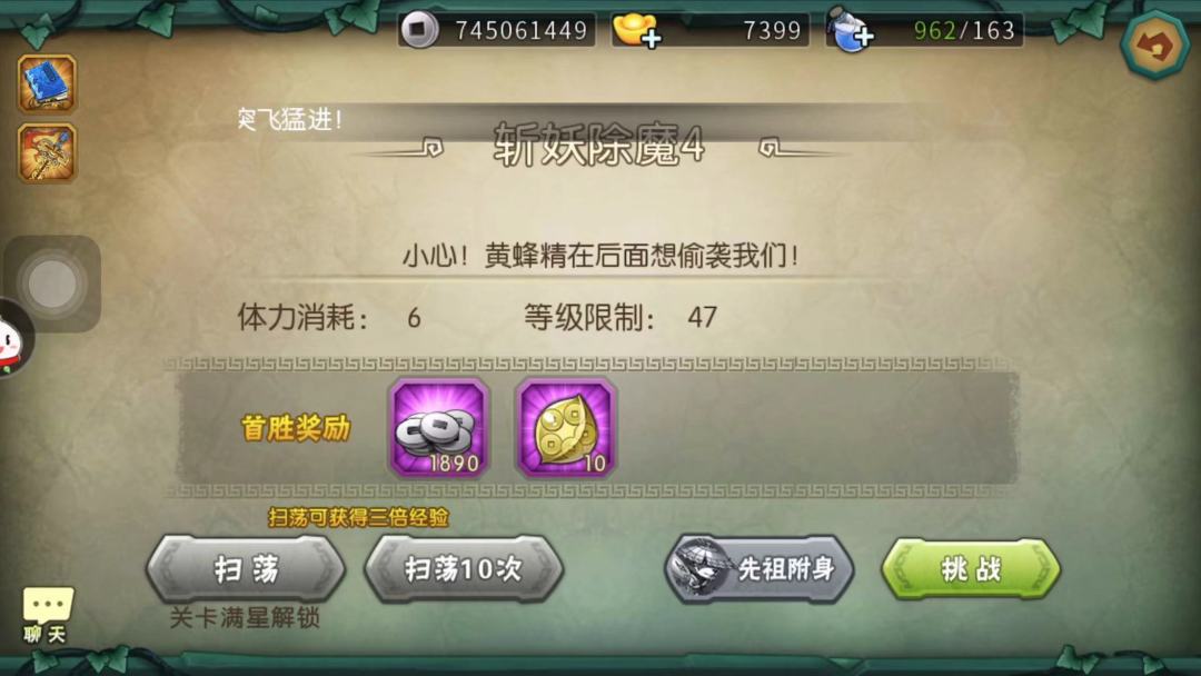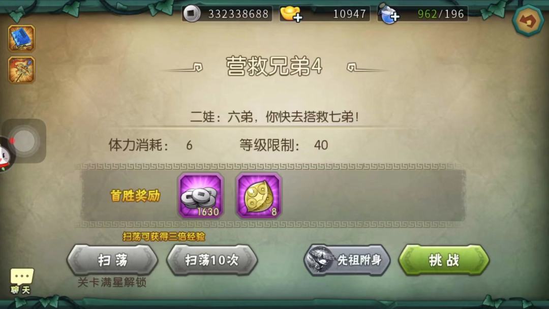 过关阵容:145【无神兽】 出战法宝:八卦镜 加成辅助:无 娃娃属性如下: 第一关:绿盾蛤蟆*1、绿蜘蛛精*2 開局直接放八卦镜法宝,留一手四娃技能,前面小怪伤害低。 第二关:紫盾蛤蟆*1、绿盾蛤蟆*1、绿蜘蛛精*1 直接放四娃技能,大娃存能量。 第三关:金盾蛤蟆*1、掷矛蝙蝠精*1、绿蜘蛛精*2 进去直接技能就行,这关无压力! 10-1还是很轻松的 没有压力!三星通过~