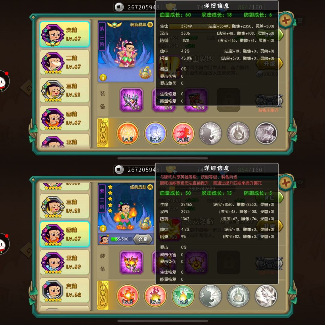 十二章第七关 英雄:大娃,四娃,五娃 法宝:空警02 大娃,67级紫色3阶装备空,四娃,67级紫色3阶装备空,五娃,59级紫色3阶装备空 无祈福,没吃道具 開局托管放飞机,然后不放技能,第一小关结束大娃满技能,四娃五娃差一点满技能,进入第二小关直接大娃技能,随后跟四娃五娃的技能也满了直接放,剩最后一只抗血的怪就不要在放技能了,平打进入第三小关,如果大娃卡不住后面的吐火怪的话,建议就是控第二次吐火,