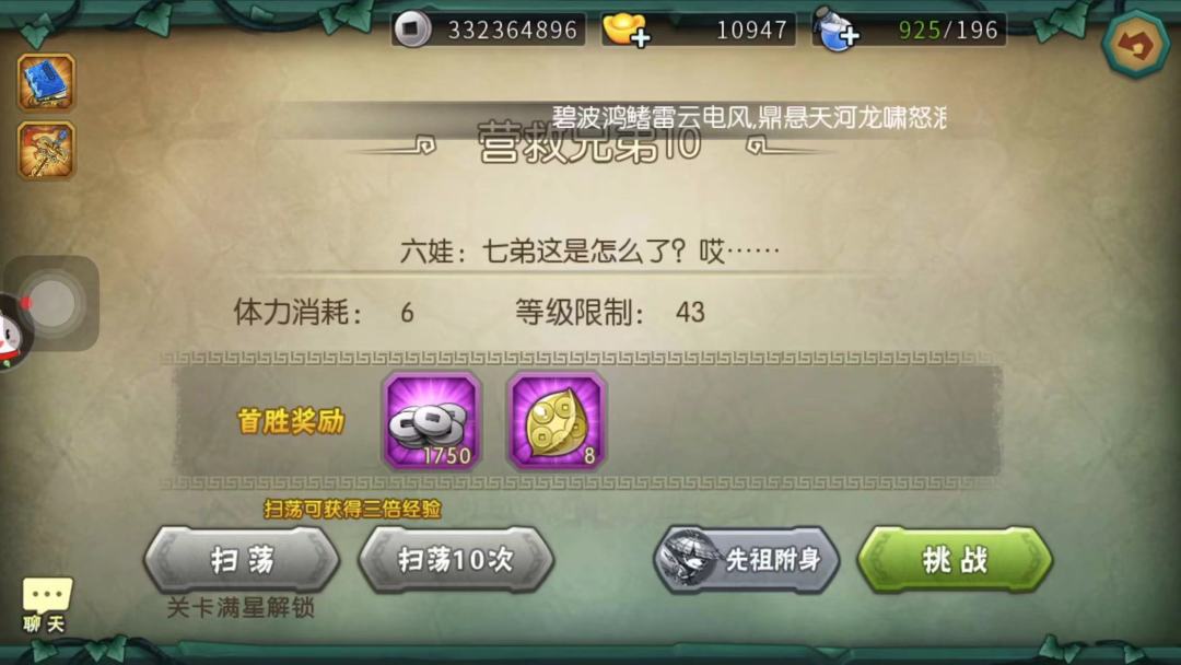 大娃和五娃拥有神兽以来,没有金刚的玩家也可以轻松推19章了,今天小号推19-3: 阵型:14570+幡+02,辅助道具:祥龙令 1457武装,150原技能,47新技能,15骑乘神兽,全部先祖附身,如果属性不够也可村庄祈福 第一关:開局直接放幡,3只魔狼对前排伤害较大,幡结束可4娃技能然后再放02,也可直接放02,法宝结束1技能控前排紧跟47技能,5和蝴蝶注意补血,只剩1只魔狼时平打留技能和拖
