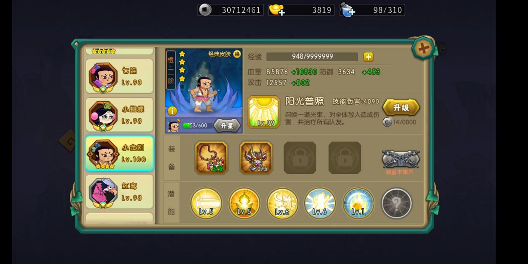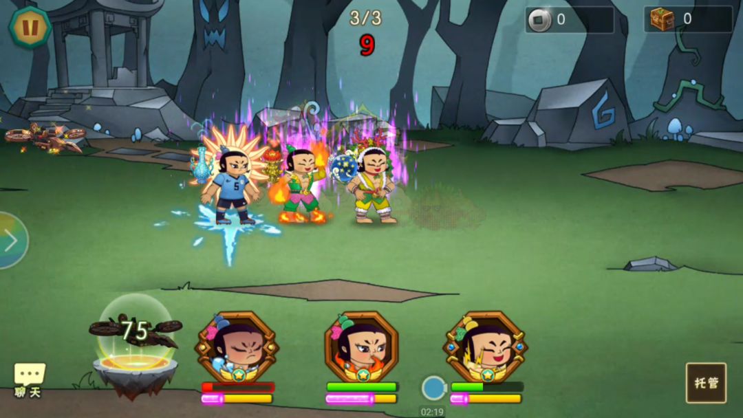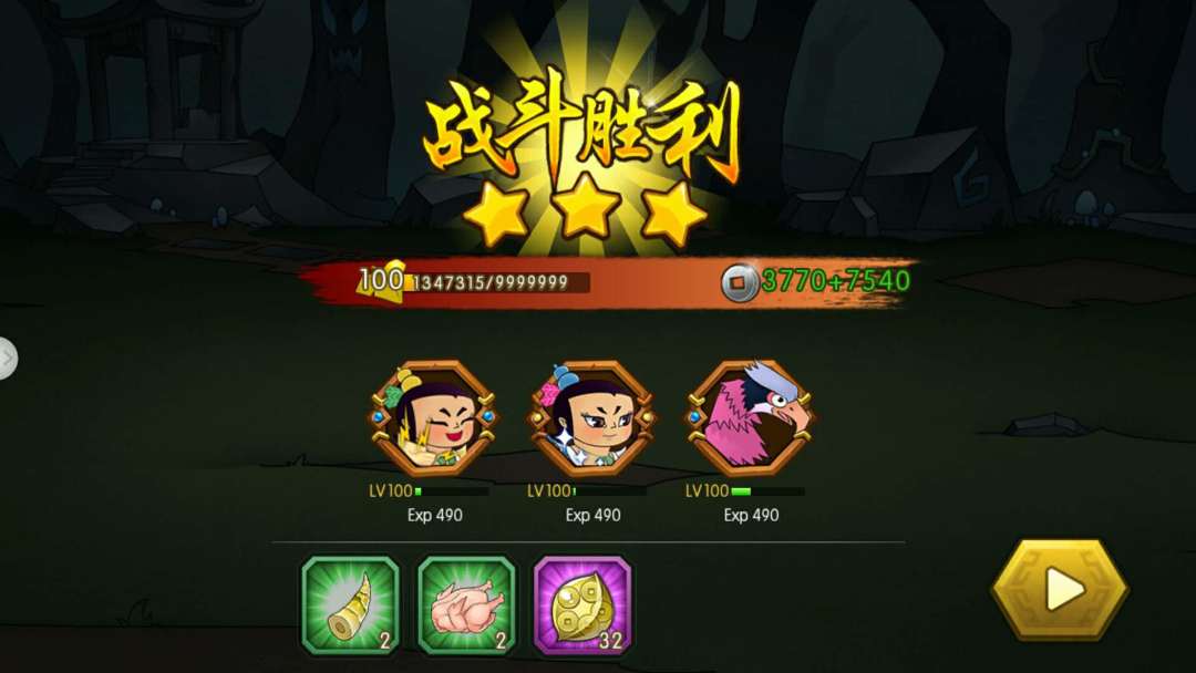 娃娃属性介绍: 小金刚 七娃 小蝴蝶 食物:凉皮 法宝:诛仙剑 月光宝盒:四星 进入正题:第一小关 怪物介绍:一只石化怪(1分08秒在出两只),一只飓风怪 进场放法宝,小蝴蝶有技能就放,如果小金刚能量没满,七娃打死飓风怪也是可以的.七娃变大后,平砍第二只石化怪快死时放技能. 然后继续平砍打死第三只,留一只慢慢打回复能量. 注意事项:小蝴蝶放技能触发第一潜能的时候,金刚或者七娃打死飓风怪变大时,潜能