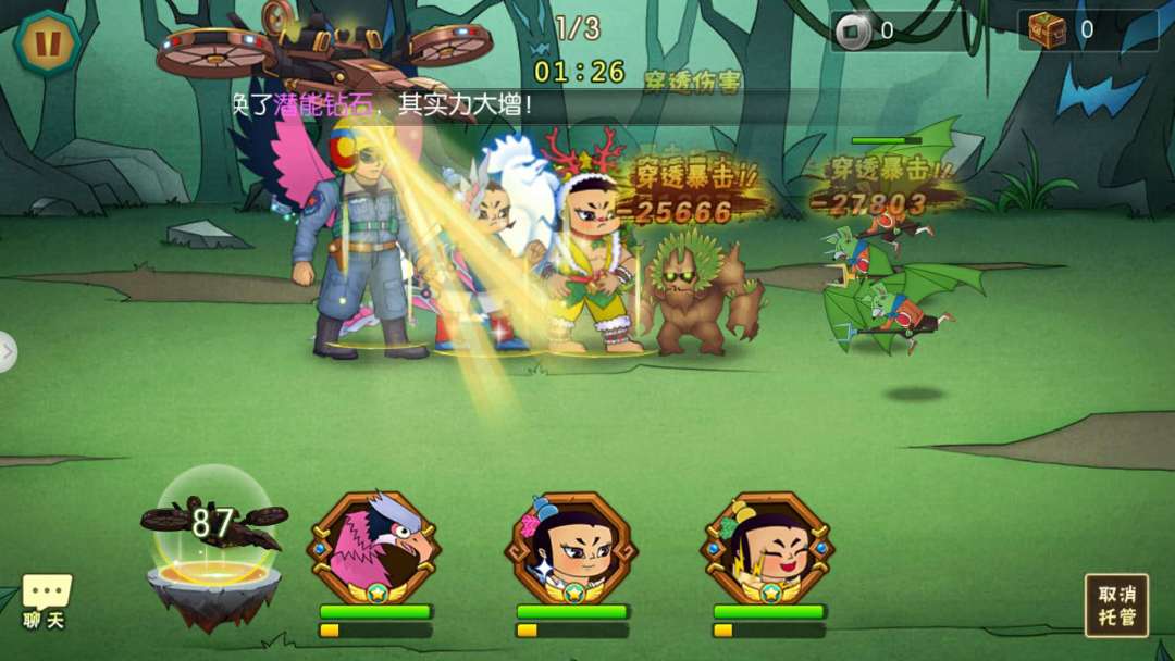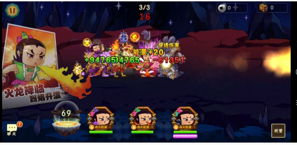 十二章第四关 英雄:大娃,四娃,五娃 法宝:空警02 大娃,67级紫色3阶装备空,四娃,67级紫色3阶装备空,五娃,59级紫色3阶装备空 无祈福,没吃道具 開局平打,不放法宝,大娃技能先满,直接放,进入第二小关直接5娃技能,然后放大娃跟四娃的技能,平打进入第三小关,托管放飞机,**完前排跟中排的小怪,还剩后排吐火的,打的慢的会替补出场2只吐火的,出来直接大娃技能,四娃五娃有技能就放,就可以过关了 下