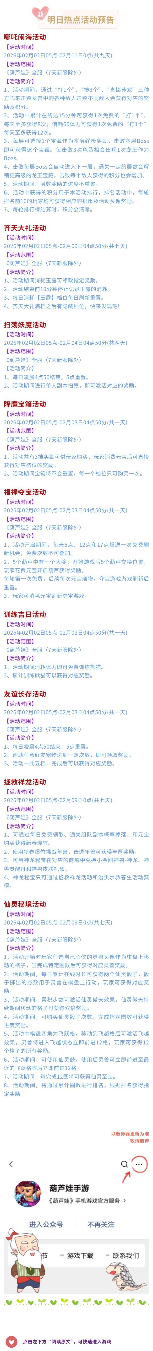 【葫芦娃】2月2日活动预告