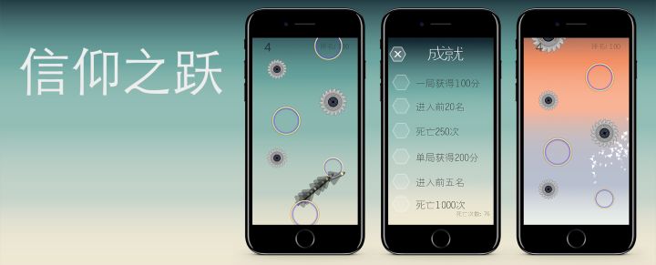 信仰之跃,是我在业余时间制作的一款街机风格的飞跃游戏。你只需要点击一次屏幕即可完成一次跳跃,但是注意要躲开齿轮的缠绕。规则很简单,但是要玩的好可没那么简单。欢迎试玩,有问题欢迎反馈,谢谢。