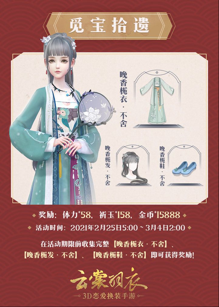 活动期间收集【晚香栀发·不舍】、【晚香栀衣·不舍】、【晚香栀鞋·不舍】即可领取奖励:体力*58、祈玉*158、金币*15888,请留意活动开启时间哦~ 祝各位大人天天开心,请继续支持云裳羽衣。