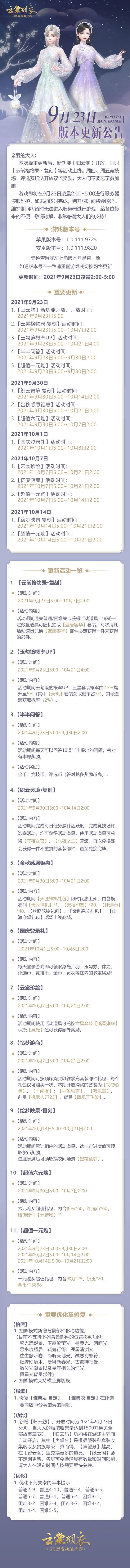 划重点: 新增了拍照横屏和背景移动功能!!!不过有部分背景还不能移动,具体看公告。 9.23:新功能“归云舫”上线,云裳格物录“盛唐容华”复刻,玉勾镜“天玑”套up 9.30:织云灵境“永夜之主”、“守夜女官”复刻,换衣间礼包“天匠神机”上架,换衣间礼包“丝路驼铃”、“紫荆寒关”、“山海守望”复刻,六元购腰饰云鳞尾 10.1:国庆登录礼 10.7:新六星套装“镇国雍华”上线!!!“忆梦游商”累充复