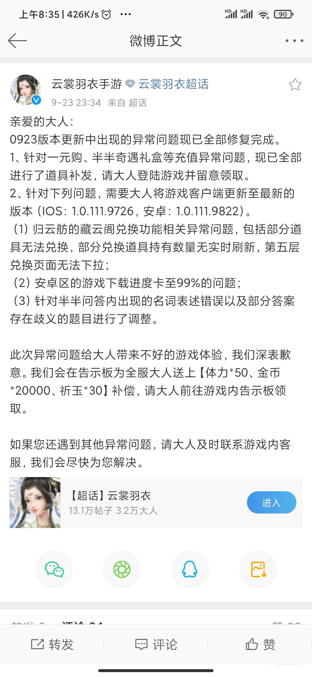 亲爱的大人: 0923版本更新中出现的异常问题现已全部修复完成。 1、针对一元购、半半奇遇礼盒等充值异常问题,现已全部进行了道具补发,请大人登陆游戏并留意领取。 2、针对下列问题,需要大人将游戏客户端更新至最新的版本(IOS:1.0.111.9726,安卓:1.0.111.9822)。 (1)归云舫的藏云阁兑换功能相关异常问题,包括部分道具无法兑换,部分兑换道具持有数量无实时刷新,第五层兑换页面无